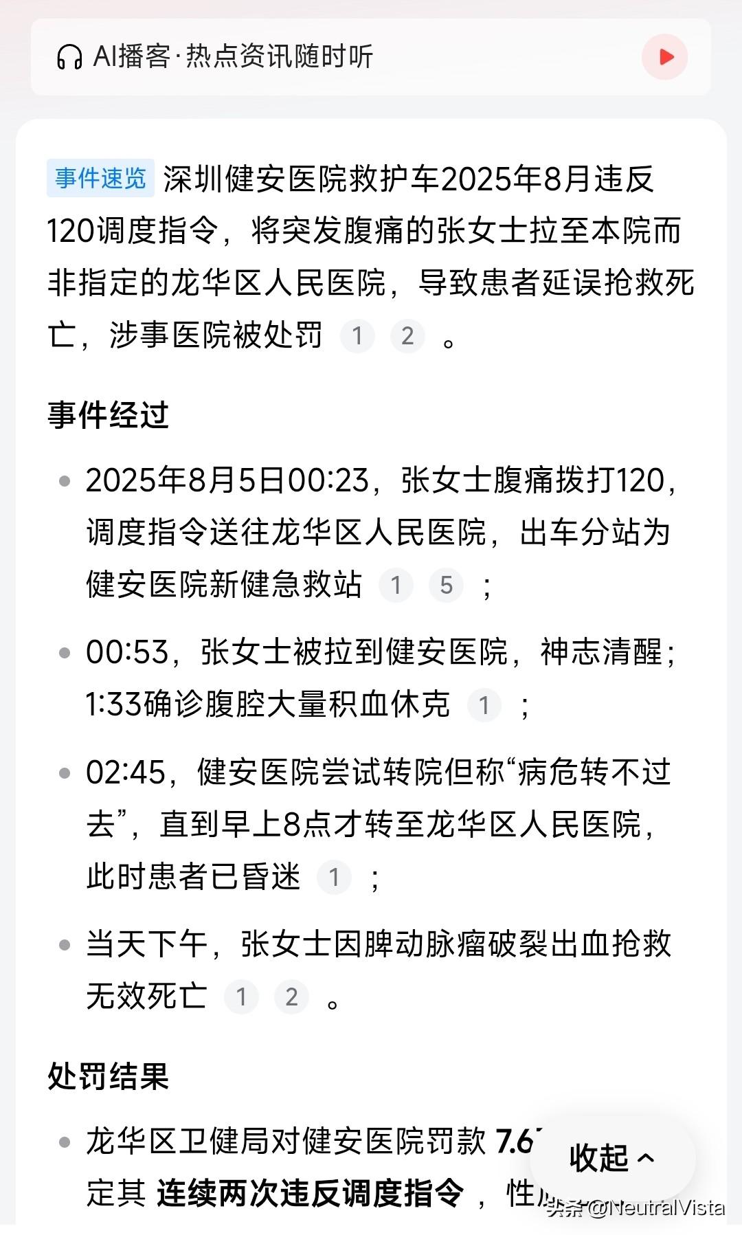 深圳一家私立医院没有对应病情急救资质和条件。不顾患者和调度中心要求,强行把人拉到自家的建安医院。张女士(患者)凌晨零点三十分左右因为腹痛拨打120要求要送到三甲龙华人民医院。建安医院救护车眼看肥肉罔顾患者病情强行送到自家医院。送到就送到能救也不算什么事情。零点五十分送到结果一点三十分发现病情严重患者意识已经模糊不清。这时候着急把锅甩出去,结果没医院肯接收。硬生生拖到早上8点,把患者生机硬生生拖没了,才把人送到龙华人民医院。非常不幸,下午张女士因为脾动脉瘤破裂导致大量出血抢救不及时死亡。