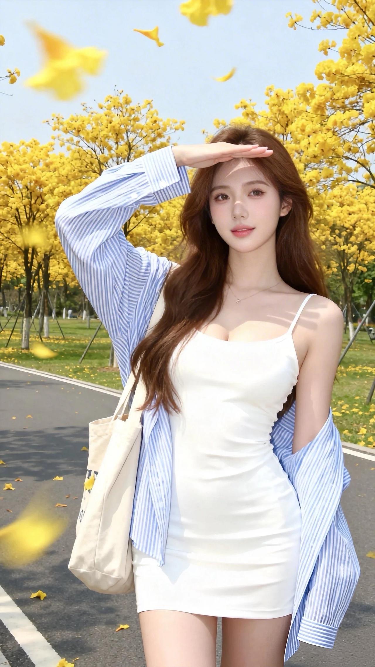 背景是盛放的黄花风铃木,金黄的花朵如云似霞,与她的穿搭色彩形成鲜明对比,明媚又治愈。她抬手遮阳,身姿轻盈,每一个动作都充满了活力与朝气,美得耀眼又动人。