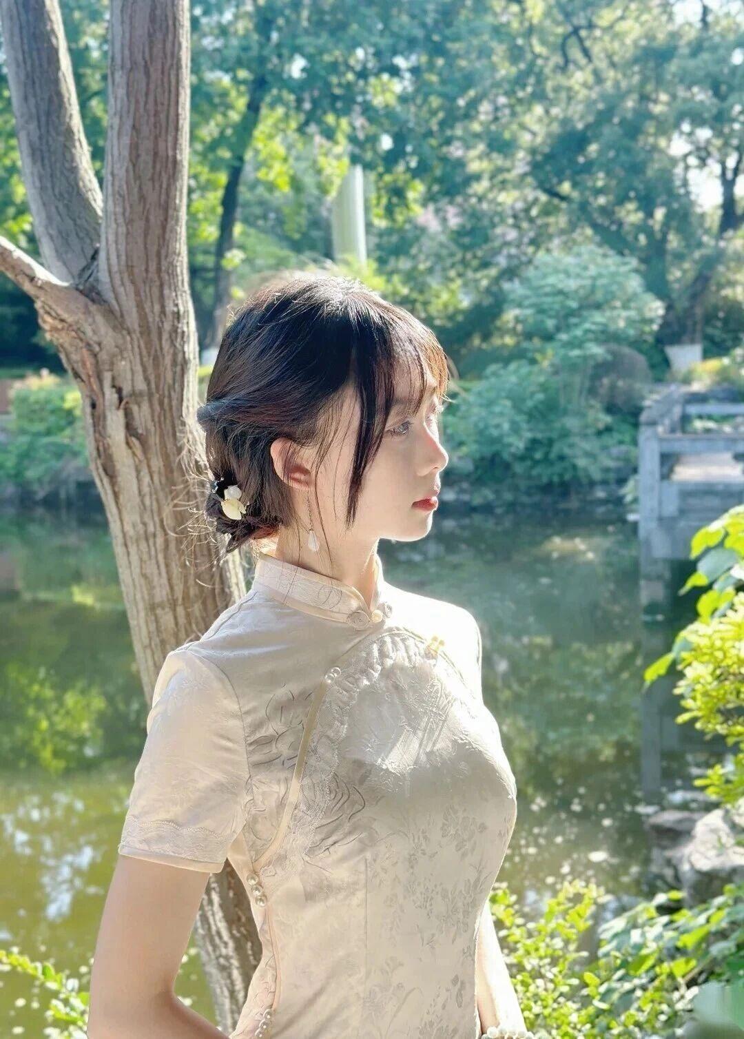 身着一袭米白色暗纹旗袍,面料温润细腻,低调的花纹尽显高级感。旗袍剪裁合体,完美勾勒出曼妙身姿,开衩设计更添几分优雅与含蓄,将东方女性的曲线美展现得恰到好处。