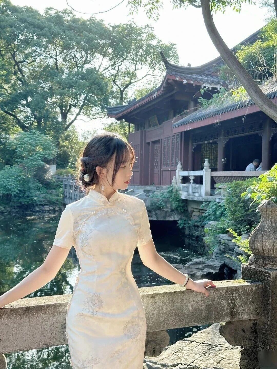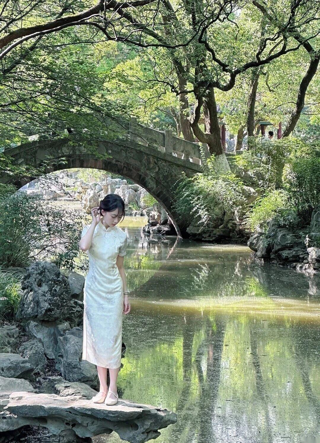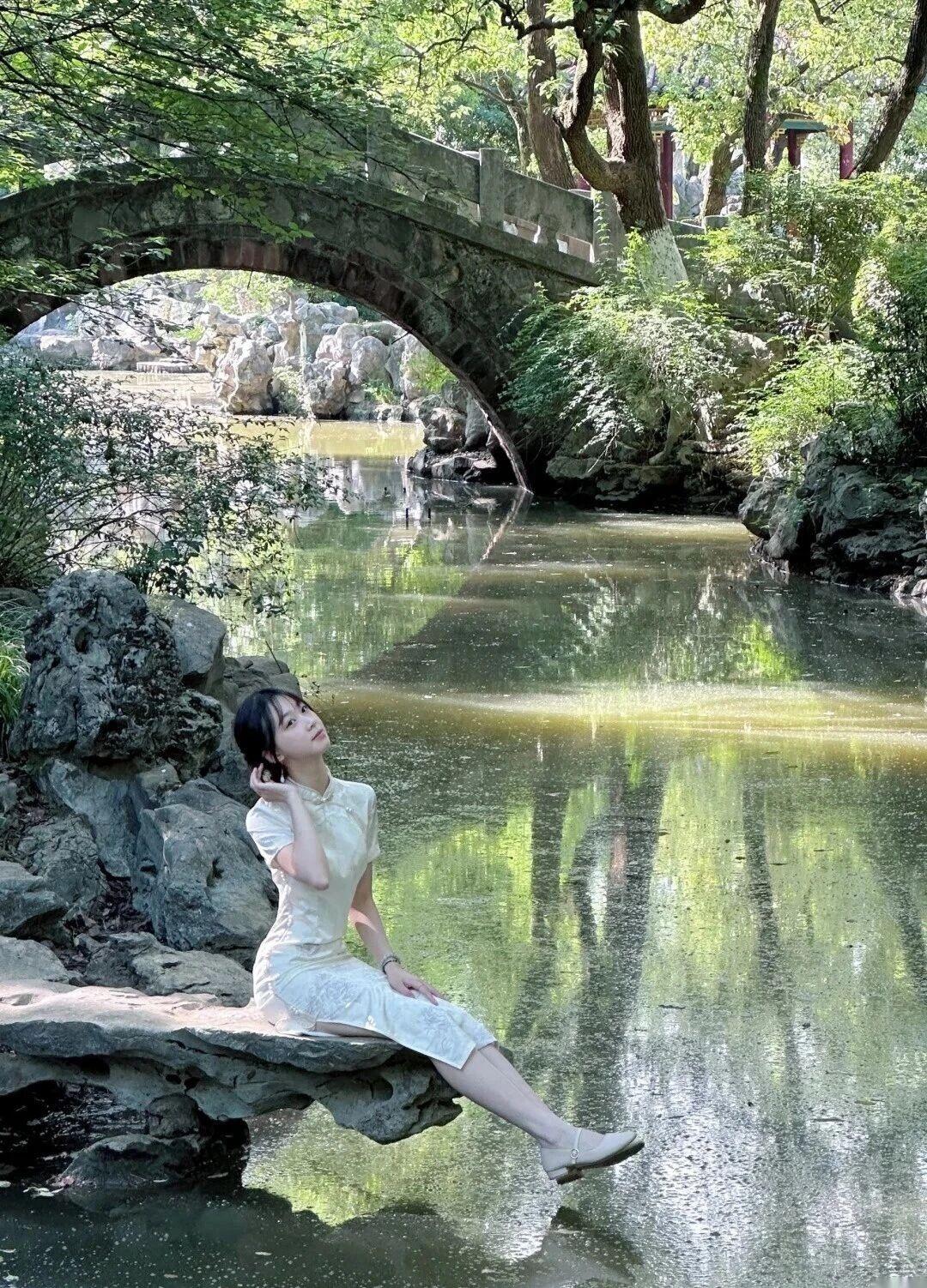 背景是绿意盎然的江南园林,小桥流水、亭台楼阁、绿树成荫,与她的旗袍相得益彰。她或静立桥头,或倚栏远眺,或坐于石上,每一个姿态都温婉动人,与周围的景致融为一体,美得如诗如画。