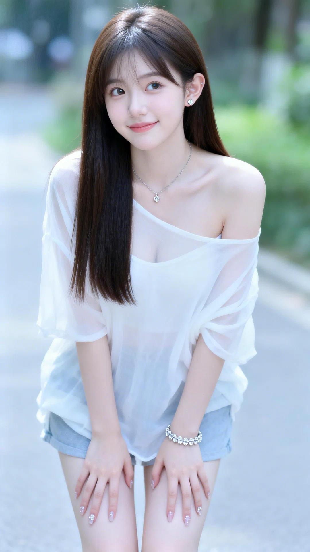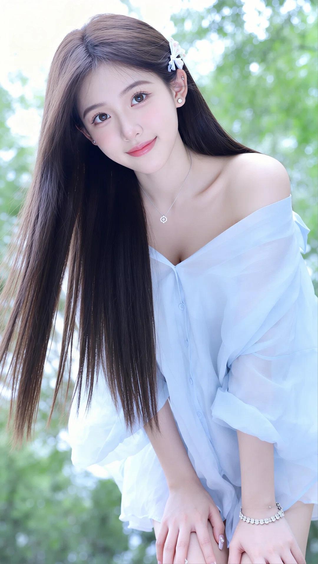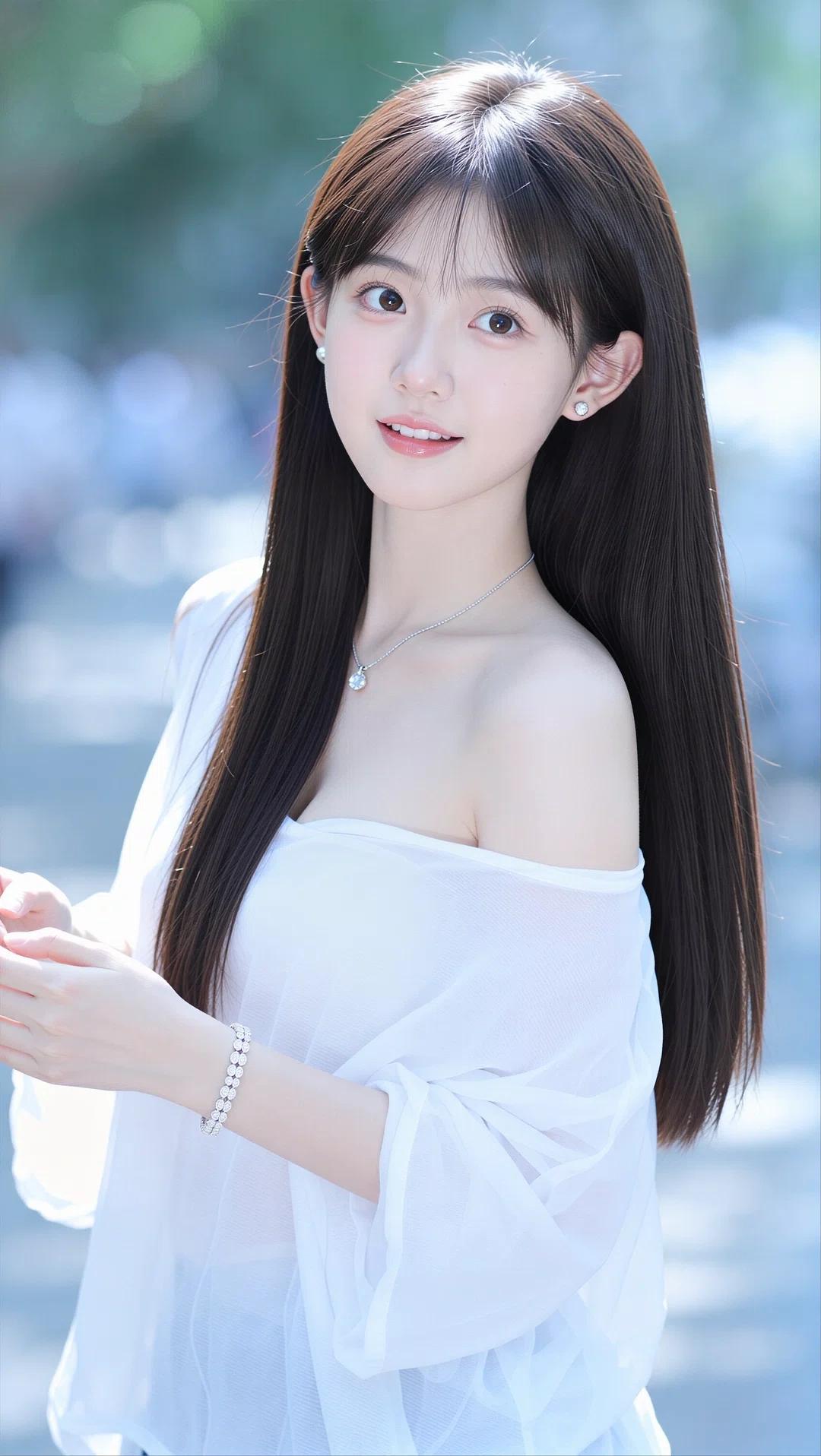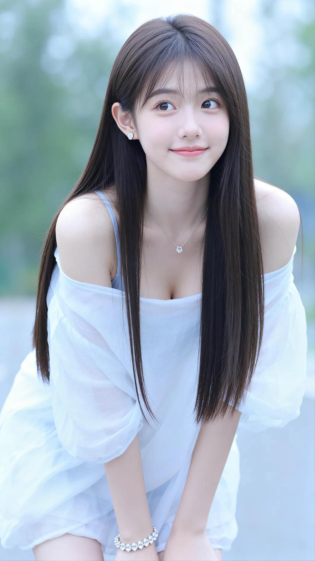 她有着一头乌黑柔顺的长直发,发丝垂顺如瀑,空气刘海衬得脸型愈发小巧精致。五官清丽脱俗,一双清澈明亮的杏眼眼波流转,带着几分无辜与灵动,鼻梁小巧挺翘,唇色粉嫩,笑容甜美治愈,肌肤白皙通透,尽显少女的娇俏与纯粹。