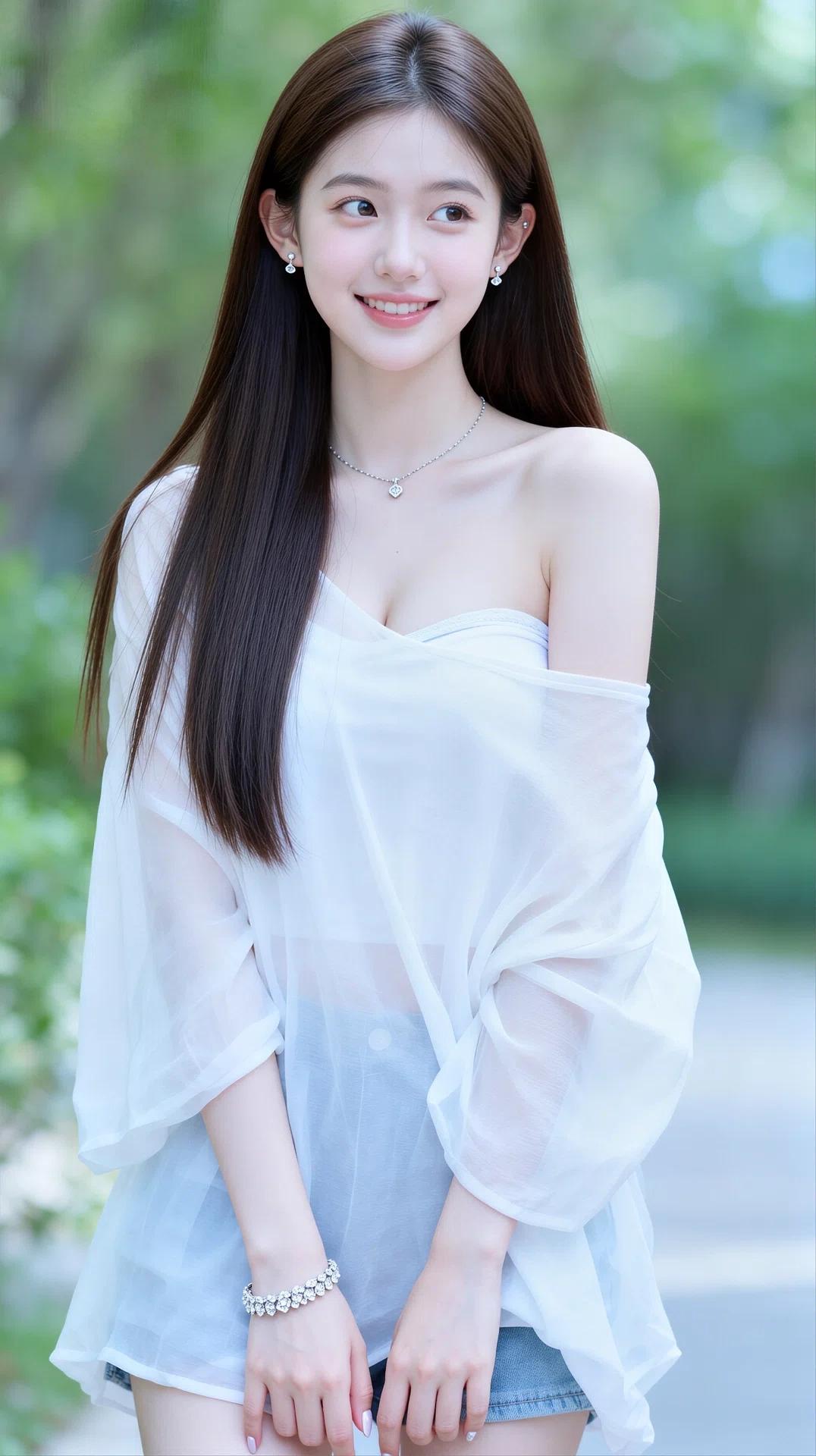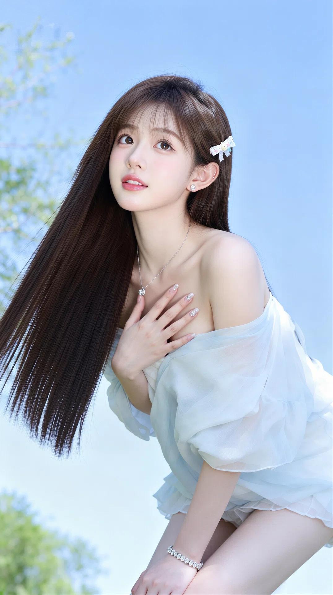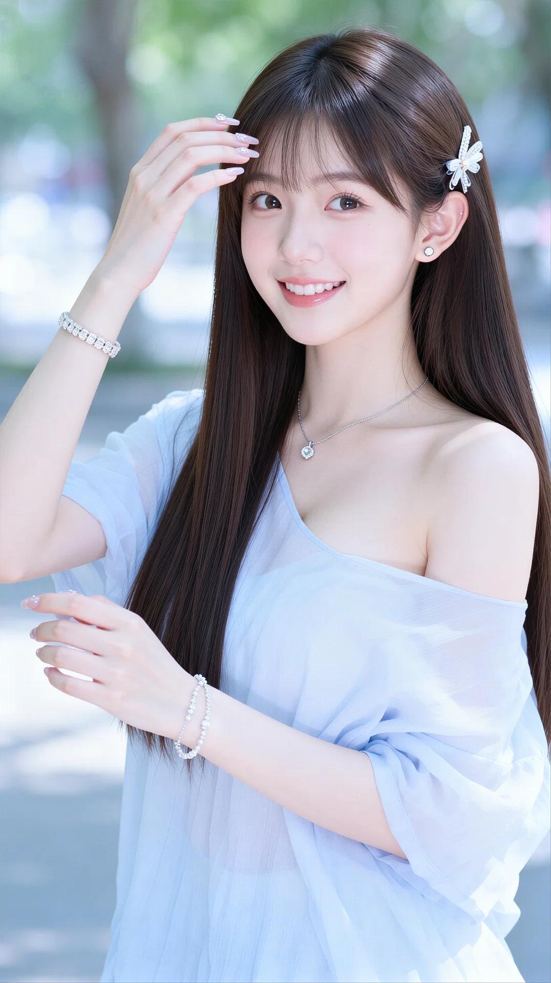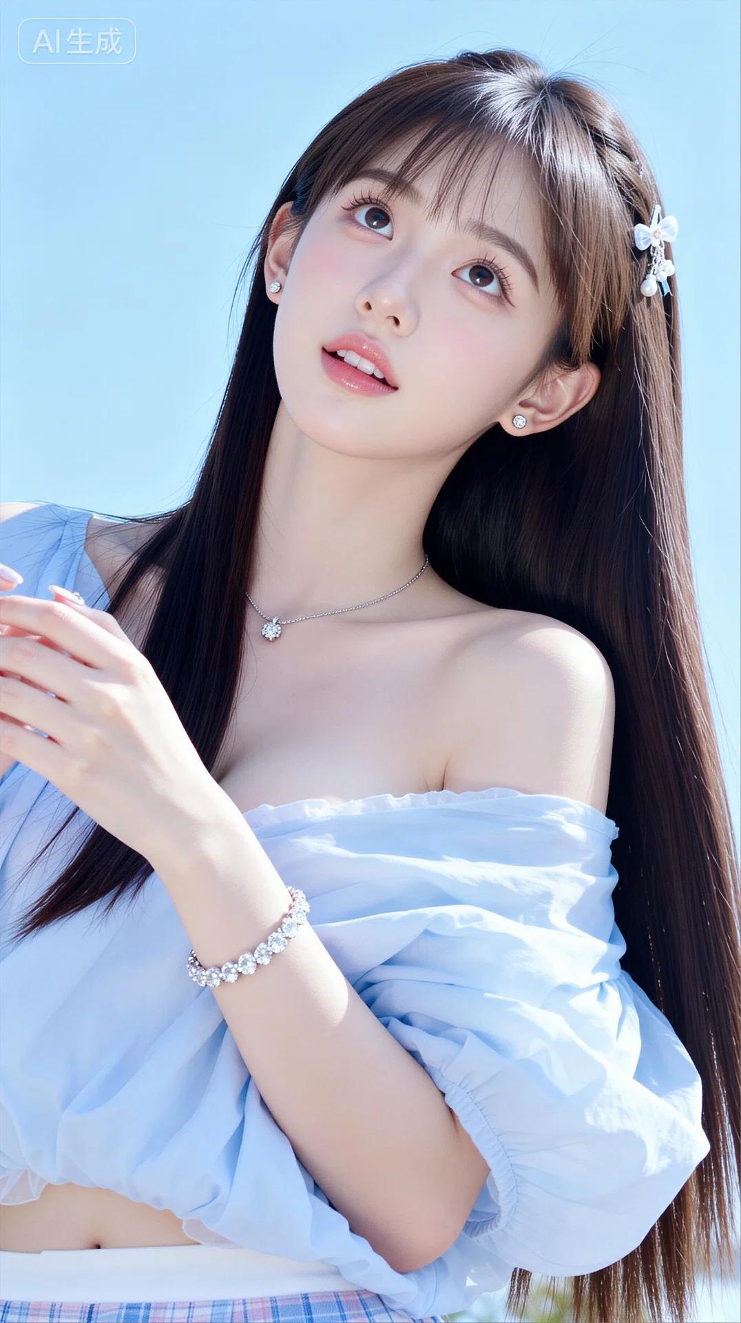 身着一袭浅蓝/白色露肩薄纱上衣,面料轻盈飘逸,自带朦胧的仙气,露肩设计巧妙地勾勒出优美的肩颈线条,性感又不失清纯。搭配精致的项链、手链与发饰,细节处尽显甜美与温柔。