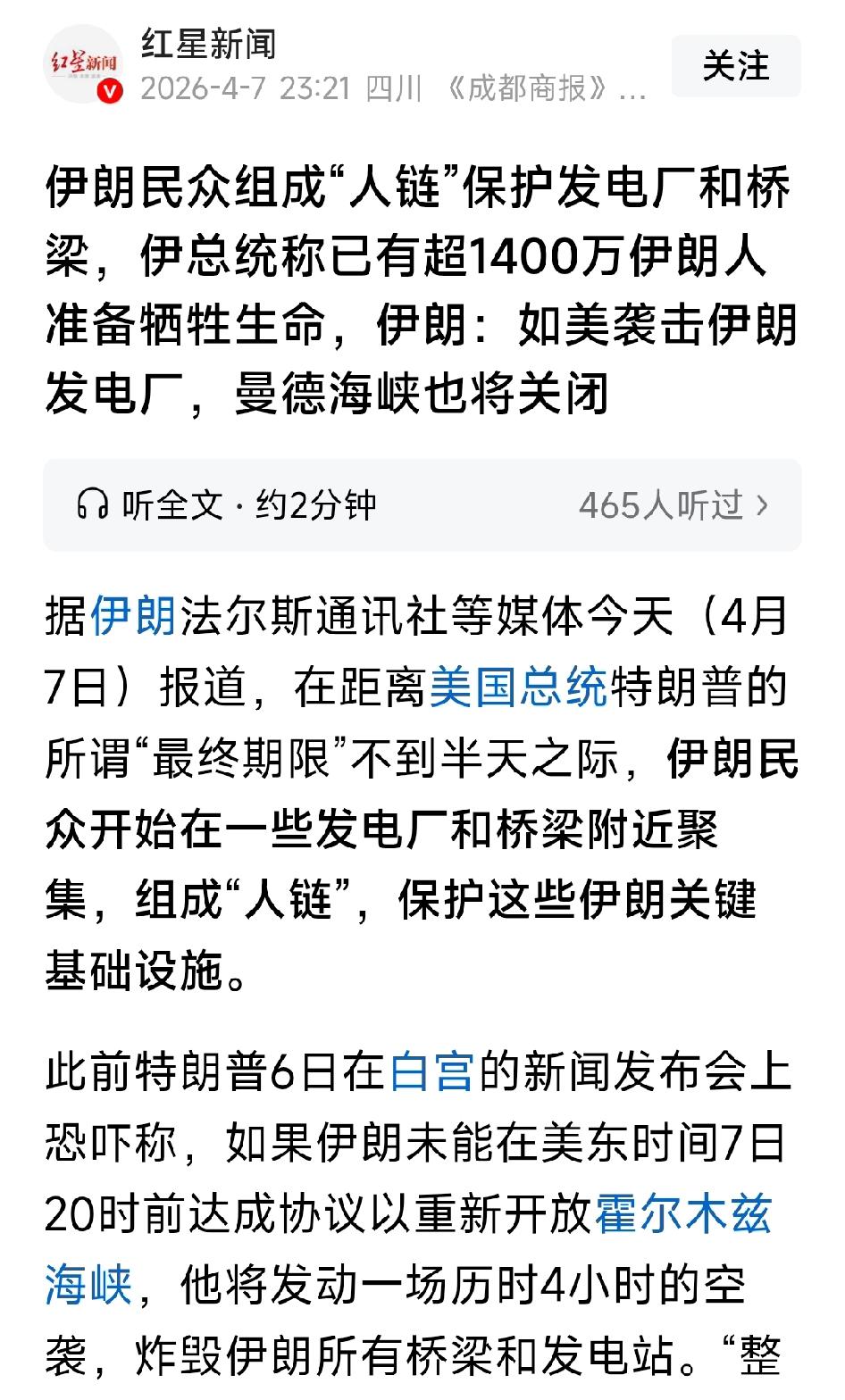 伊朗民众在一些发电厂和桥梁附近聚集,组成“人链”,保护这些伊朗关键基础设施。此前特朗普在白宫的新闻发布会上恐吓称,如果伊朗未能在美东时间7日20时前达成协议以重新开放霍尔木兹海峡,他将发动一场历时4小时的空袭,炸毁伊朗所有桥梁和发电站。整个国家可能在一夜之间被摧毁,而那一夜可能就是明夜。 为了一个士兵,美国人花几千万救援,为了一个大桥,伊朗用几千万人的生命保护。美国为了拯救一个飞行员可以花费几亿,伊朗为了一个设施可以牺牲几万个人。这就是人命在执政者眼里的价值差!让平民当挡箭牌,百姓不是军人,放下武器也行啊!不能这样干,还是人吗?更谈不上是政府官员。 苏拉曼尼的孙女和革命卫队高层子女们刚刚被特朗普吊销了美国绿卡和美国资产,美国特朗普真的是坏透了,让伊朗高层和子女们都白忙活了。 特朗普必定会袭击的。逻辑很简单,不袭击拖下去特朗普共和党大选也是必败。对特朗普而言,如果不能体面退出,那唯一选项就是不顾代价彻底打垮。伊朗人民做得对,用生命和热血宣示,坚决不向帝国主义投降,不做亡国奴!在信息社会的今天,美国这个霸主的,就是想用一个武字走天下,想称王称霸世界的,就是行不通的。 有网友发文说,如果伊朗人民为了保护基础设施而组成“人链”,铺垫在各个地方,美国人处于人道,会不扔炸弹吗?伊朗上空封锁 伊朗安保漏洞 伊朗谣言 伊朗航设施 伊朗乱象 伊朗民生现状 伊朗核设施防护