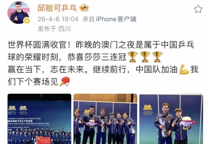 邱贻可不但发文庆祝, 孙颖莎也发文感恩, 师徒齐心合力, 果然其利断金, 澳门冠军赛孙颖莎再次夺冠, 三连冠的含金量与众不同, 创造历史记录。 孙颖莎感谢很多人, 其实自己也付出了很多努力, 永远都是在夸赞他人。 自己也是最棒的, 下一赛季会继续前行, 我觉得她可能还会站在顶峰。