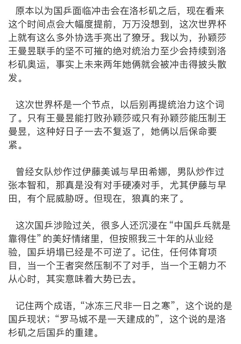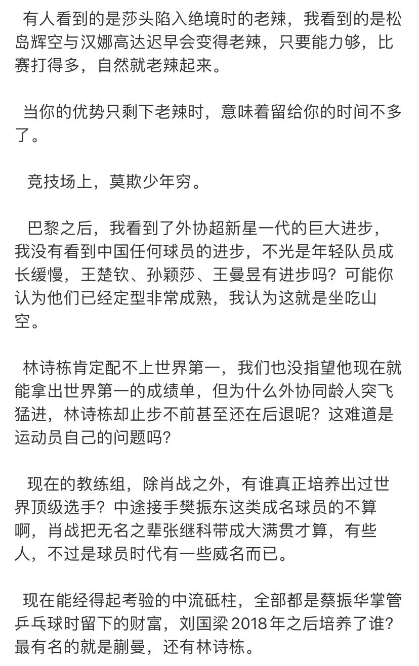 大V贺晓龙不但担心国乒后继无人, 还发了长文, 三人是骄傲。 王楚钦,王曼昱,孙颖莎三人发挥稳定, 小将们没人能脱颖而出, 温瑞博算是有潜力的了。 外协选手越来越强, 17岁的松岛辉空赢了张本智和, 和王楚钦大战7局, 险些赢了。 张本美和,桥本帆乃香,高达等人越来越强, 还有温特特殊打法, 贺晓龙的担心, 是很多人的担忧。 蒯曼越来越稳定, 我十分看好她, 陈熠还在积累经验中, 未来可期。 我觉得, 还是要加强年轻小将的培养, 多给比赛机会。