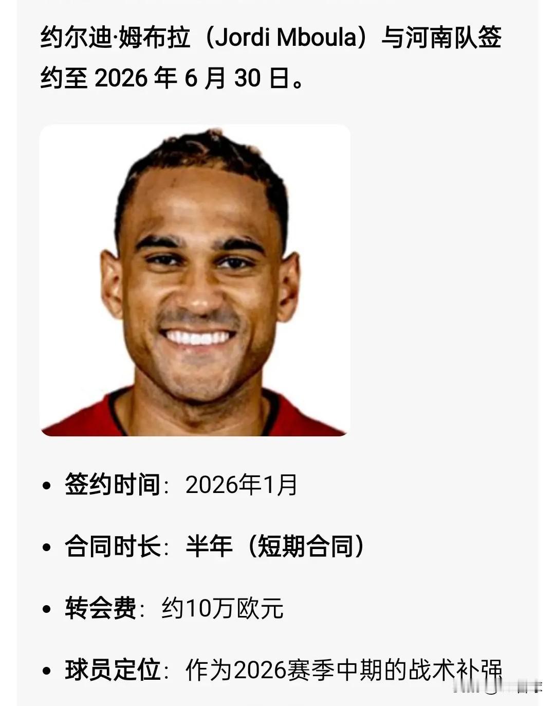第二个好消息是西班牙球员姆布拉(Jordi Mboula)与河南队的合同签约至2026年6月30日,是一份短合约,看到这里就放心了。