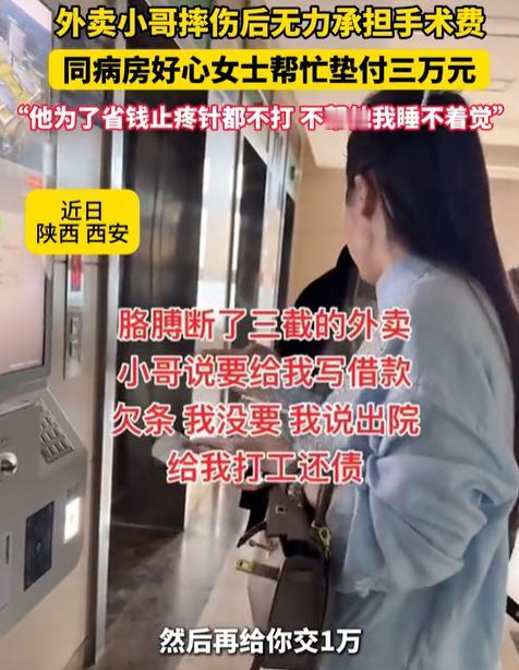看哭了!2025年3月陕西西安,赵女士在母亲的病房,看到同病房的外卖小哥,胳膊断了三节,手术费大概5万元,为了省钱,他竟然跟医生说不打止痛做手术,后来他又打电话给家人和亲戚借钱,可只借到15,000元,他很无助,如果15天之内不动手术,他的手就废了,赵女士看到了,心里很不是滋味,就帮他交了3万元,事后她母亲还说:你一定要给他留下钱,赵女士又给他留了1000元的伙食费,赵女士说:如果我不帮他,我会睡不着觉的。
