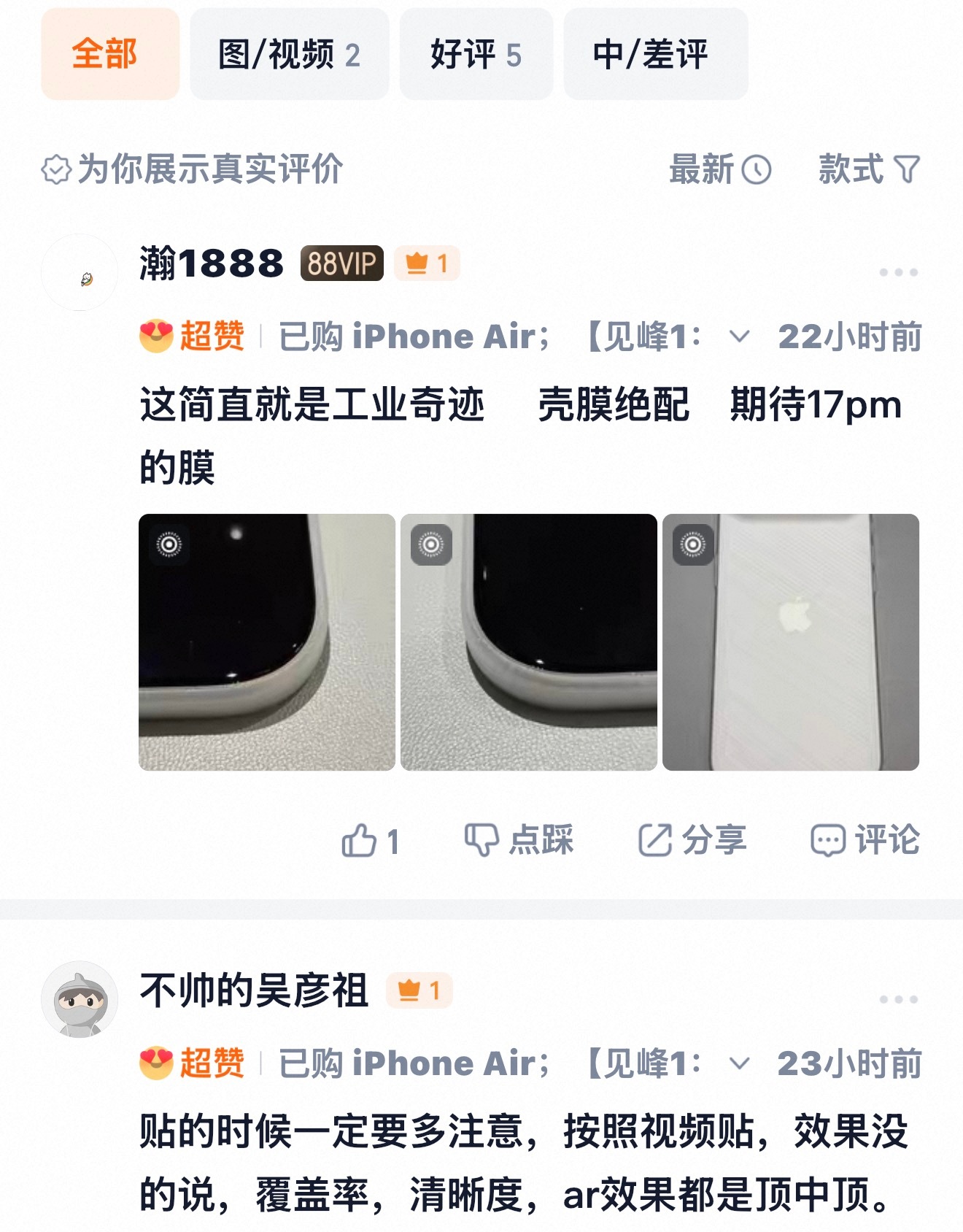 感受一下 iPhoneAir 见峰1:1的用户评价,五个评价里面有四个夸夸