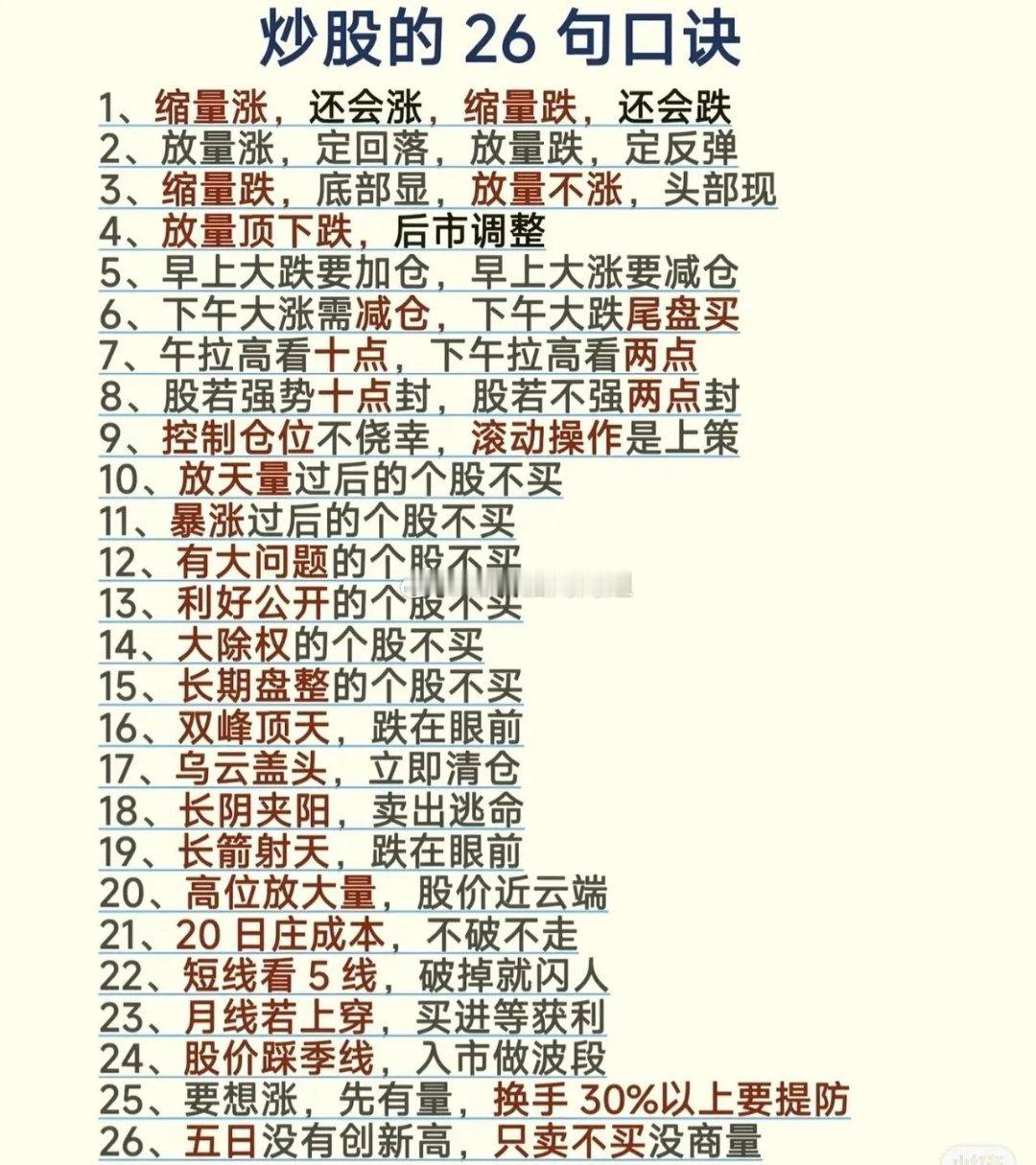 炒股口诀实用性还挺强的,就拿“底部放量要关注,突破均线是信号”来说。当股票在底部区域突然放出大量,说明有资金开始关注这只票。比如某只股票长期在低位横盘,突然某天成交量是之前的好几倍,这时候就得留意了。如果同时股价还突破了重要均线,像5日线、10日线,那可能意味着上涨行情要来了。再如“高位放量要小心,跌破均线快离场”。股票在高位放出巨量,很可能是主力在出货。要是股价又跌破了关键均线,那赶紧跑,不然利润就打水漂了。口诀能给咱提供参考,但也不能全信,还得结合其他指标综合判断,个人观点,仅供参考!