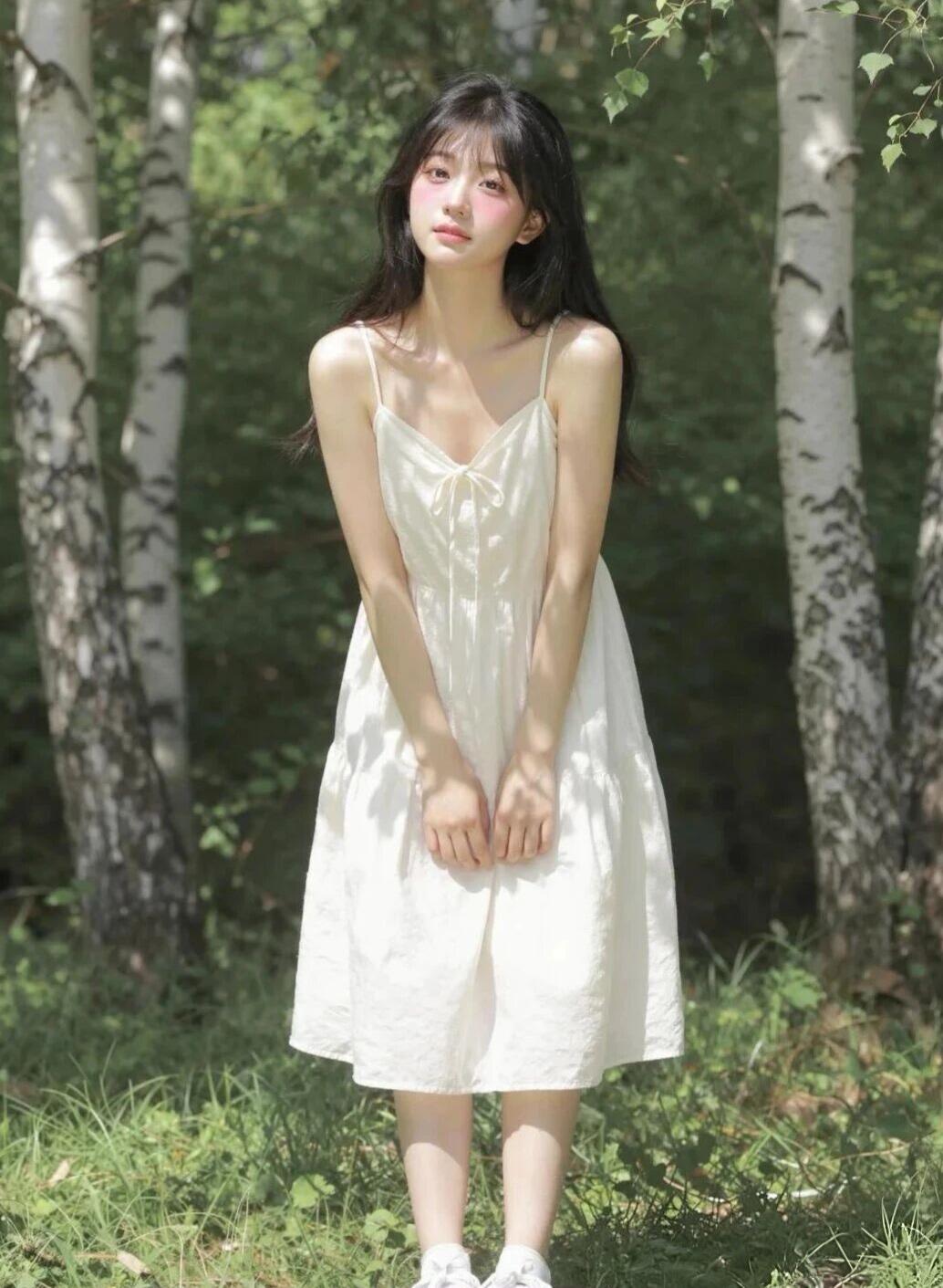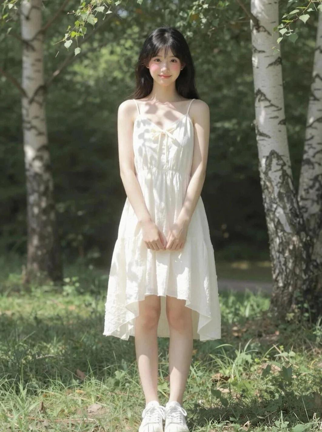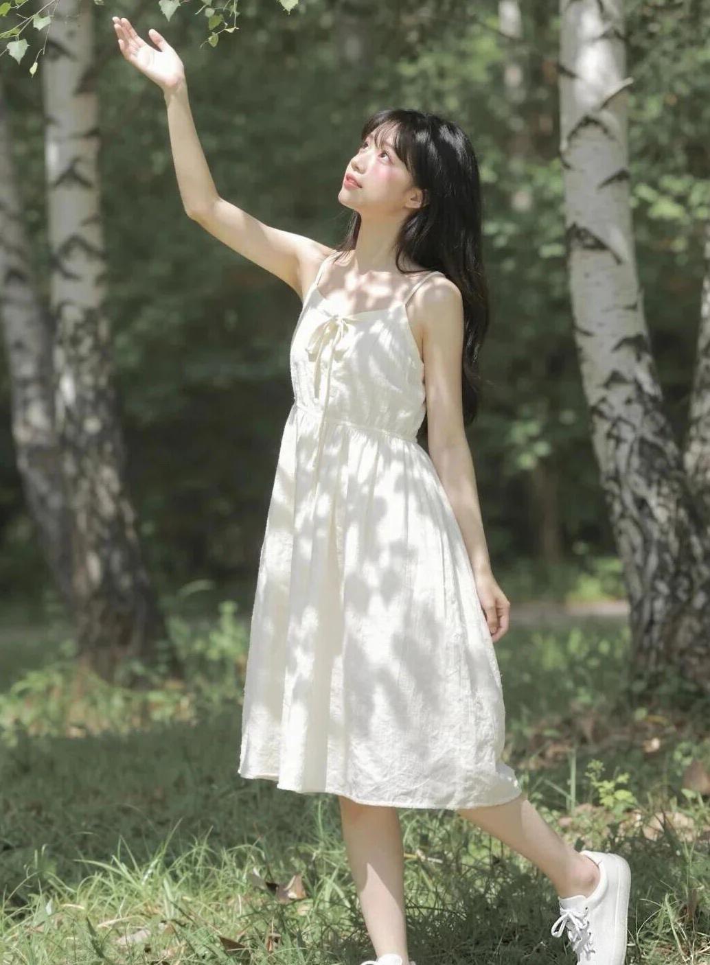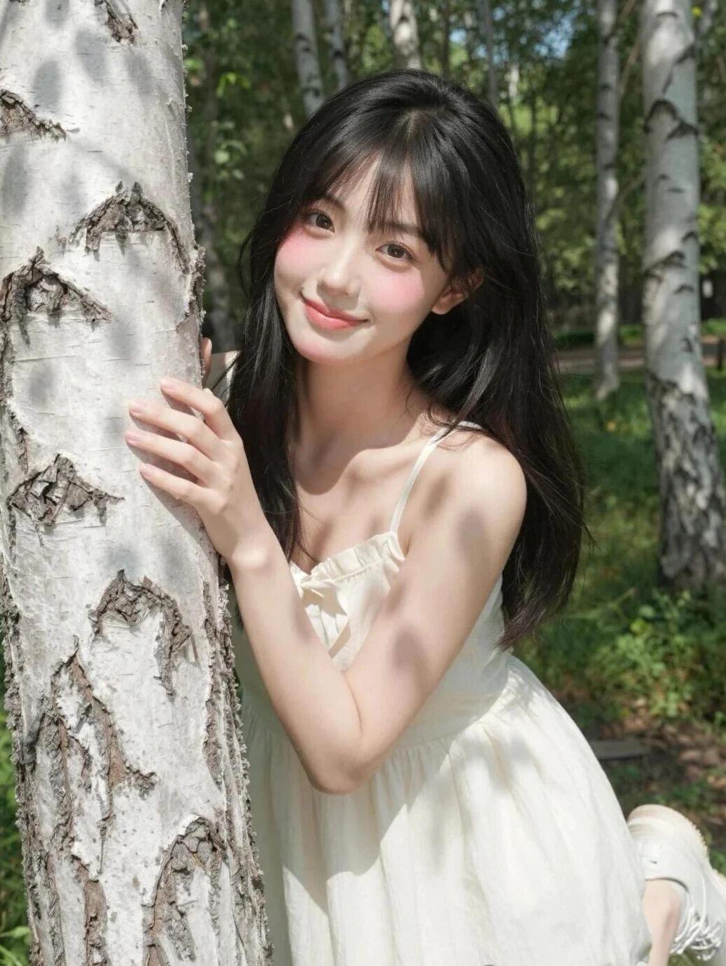林间的阳光透过树叶缝隙洒落,形成斑驳的光影,与少女白皙的肌肤、洁白的裙装相互映衬。她时而倚靠树干,时而轻触枝叶,时而温柔回眸,每一个姿态都自然舒展,仿佛是误入森林的精灵,将夏日的清新与少女的柔美完美融合,氛围感拉满。