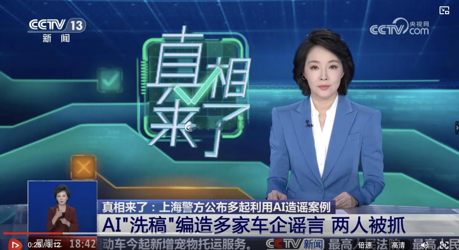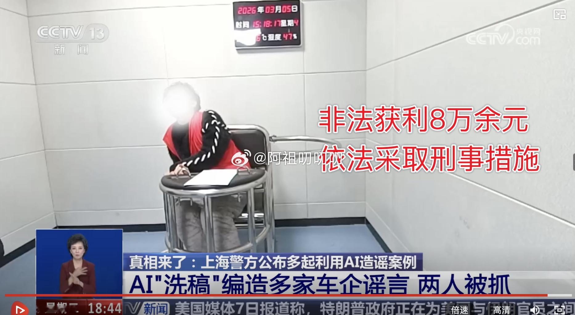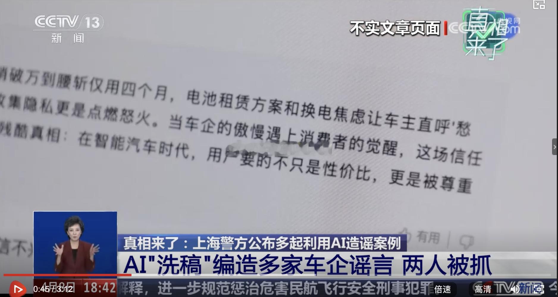 真相来了:上海警方公布AI“洗稿”编造多家车企谣言。好奇什么团伙背后金主居然只给了8万,翻了下央视原视频,是两个大甜菜为了赚平台播放奖励,利用AI输出70余万篇,盈利没多少,判的到不轻,违法获得两万以上,以非法经营罪定罪原视频并没有直接说明哪些车企举报,也没有说明哪些车企被黑,不过可以明显看出一个是黑蔚来经营不善破产倒闭,不过现在单季度盈利,销量逆势上涨;另一个是在断章取义黑小米,将醉酒驾驶冲上绿化带改成了正常行驶,这个造成的影响是真的大,真是有够欠的小米等车企遭AI造谣抹黑新能源汽车