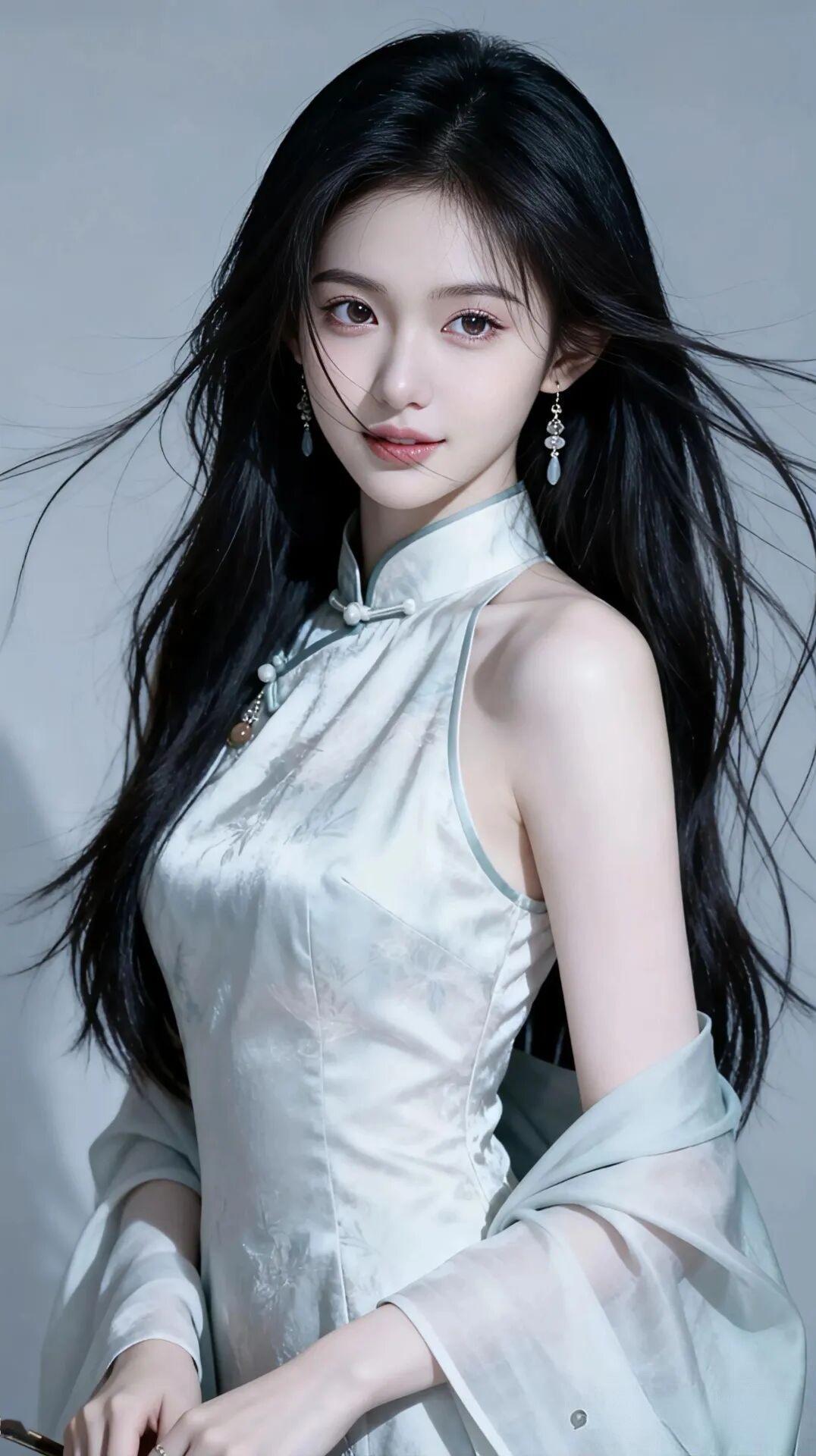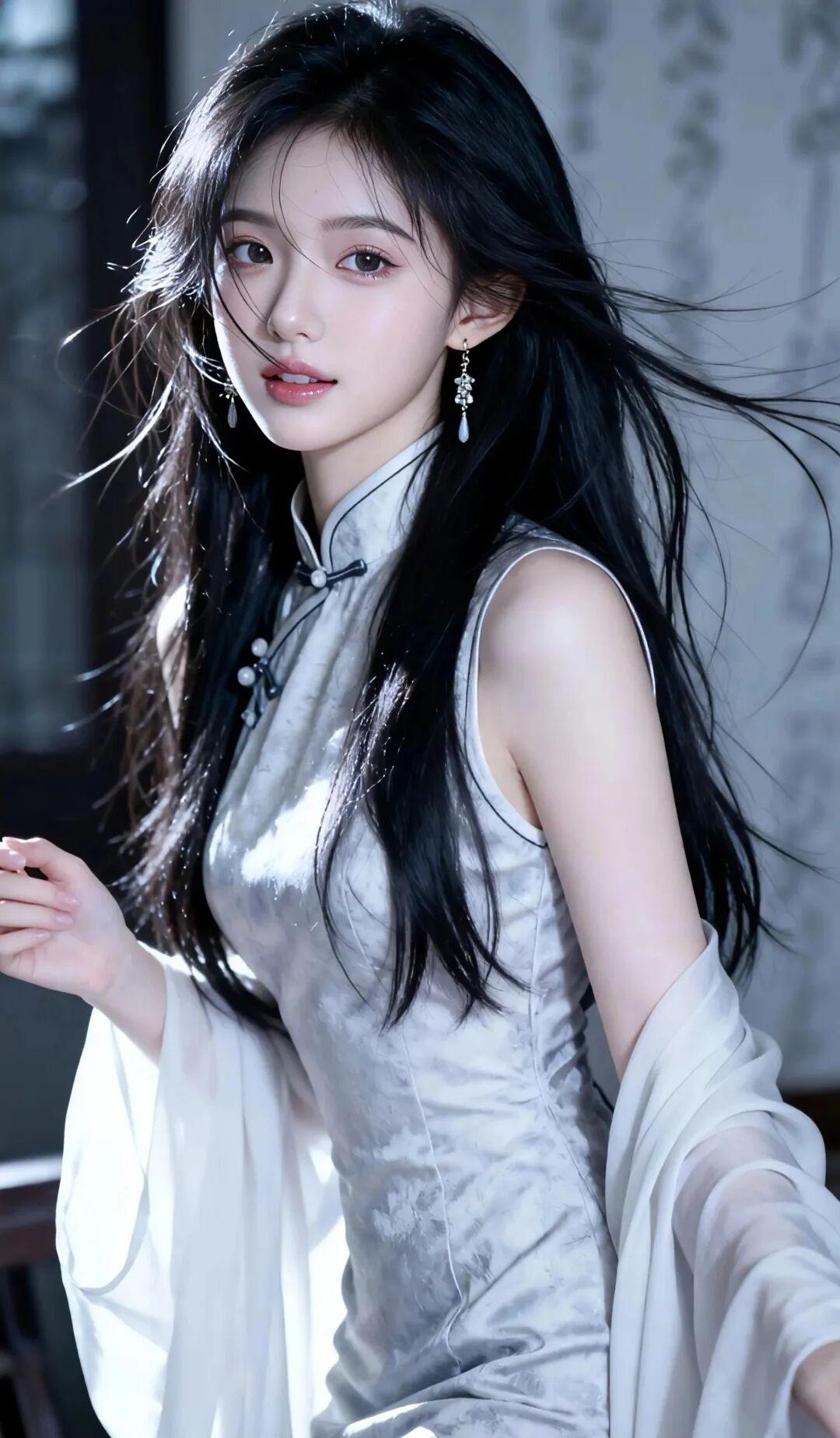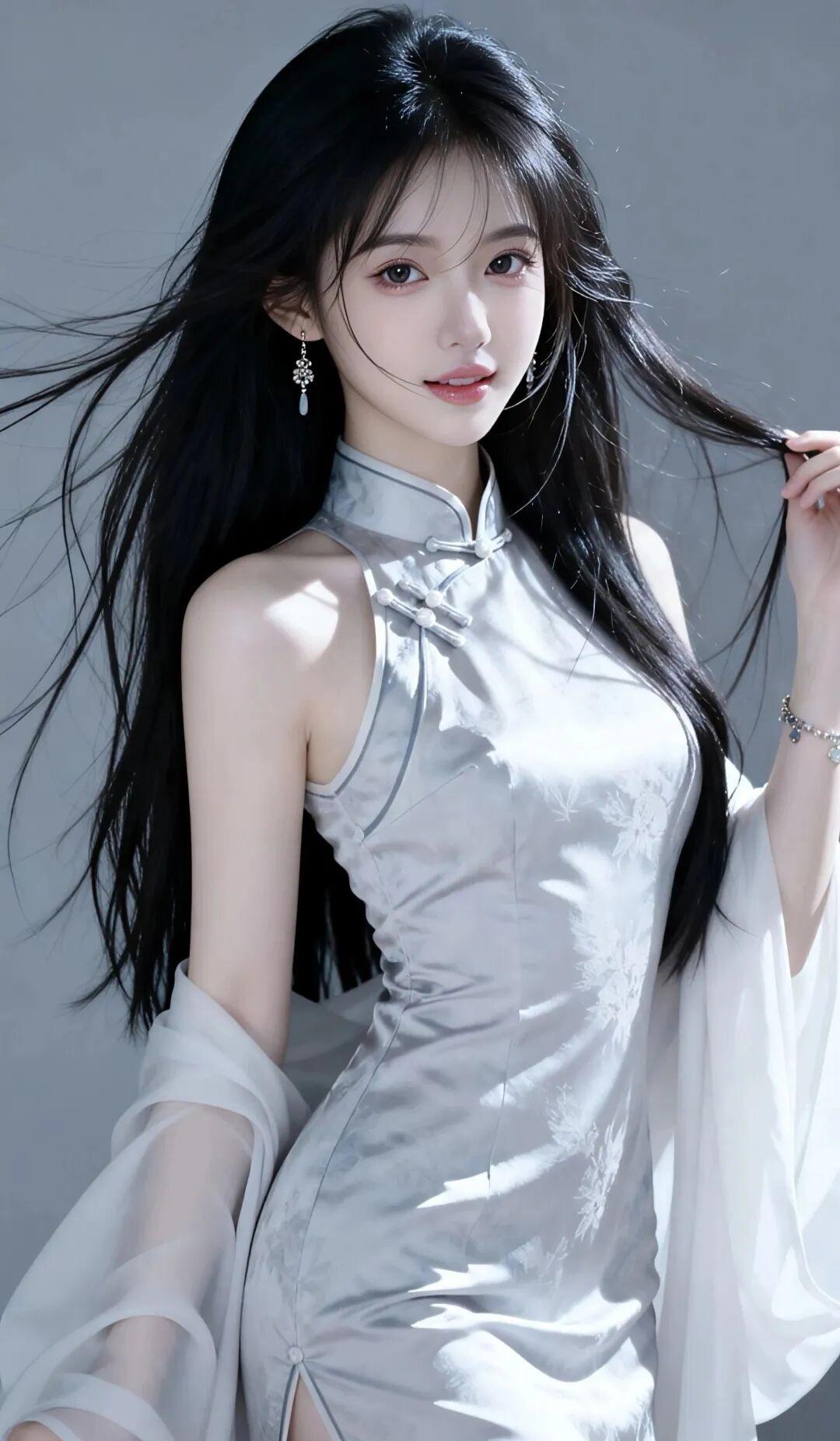 服饰风格:身着一袭浅灰色挂脖旗袍,面料为带有暗纹的丝绸质感,高级又细腻;经典的立领盘扣设计,勾勒出优美的肩颈线条与曼妙身姿;外搭同色系薄纱披肩,增添了几分飘逸与仙气。