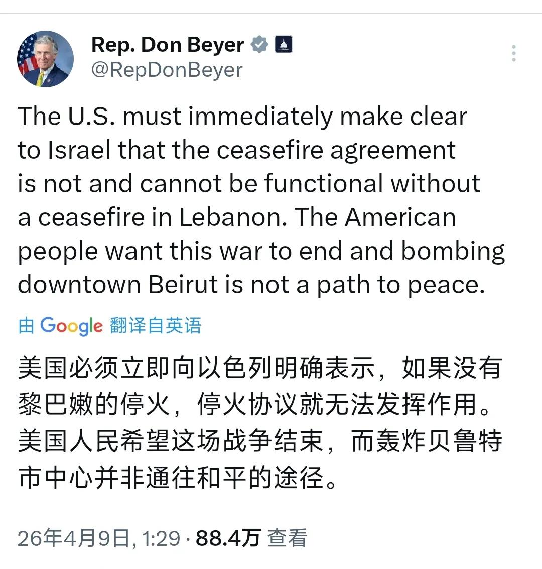 美国民主党籍众议员唐.拜尔今天(4月9日)写道:“美国必须向以色列明确表示,如果没有黎巴嫩的停火,停火协议就无法发挥作用。美国人民希望这场战争结束,而轰炸贝鲁特市中心并非通往和平的途径。〞