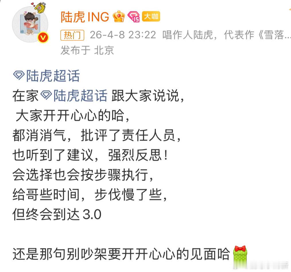 陆虎回应歌单 雪落有声,朋友有约。陆虎生日巡演3.0开启,和最懂的人,听最暖的歌。
