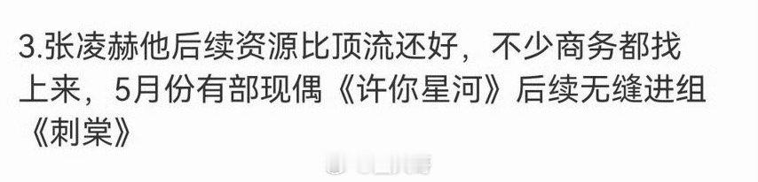 网传张凌赫今年或将无缝进组不愧是新晋顶流艺人啊,张凌赫也太涨面儿了吧,没想到在《逐玉》之后,张凌赫的资源比顶流还牛,张凌赫也将在今年无缝进组《许你星河千里》和《刺棠》。现偶和古偶都要slay的节奏啊!曝张凌赫资源比顶流还牛