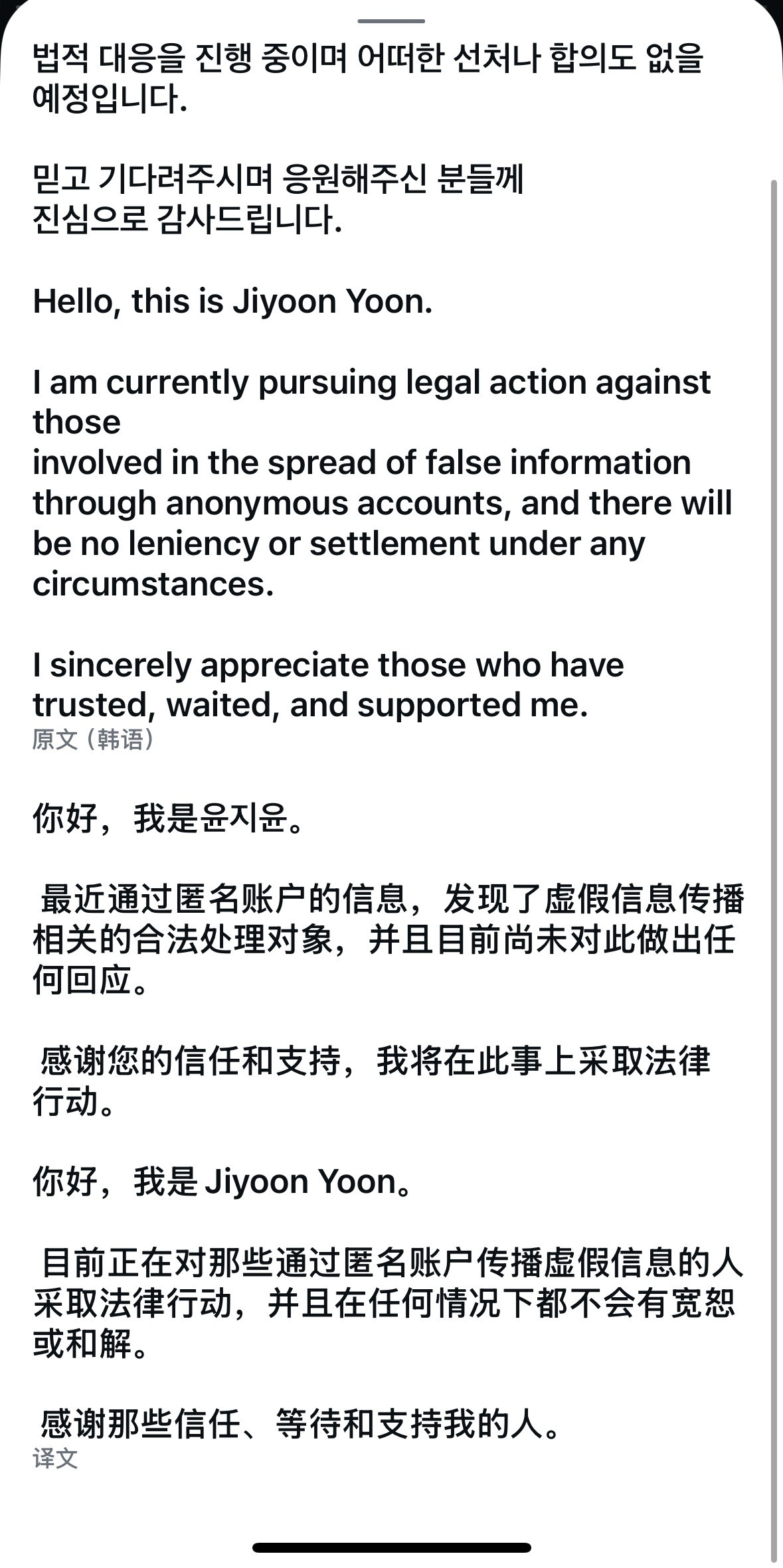 尹智允回应之前退团传闻 尹智允回应之前退团传闻,会采取法律措施,原po自证图被扒出疑似AI