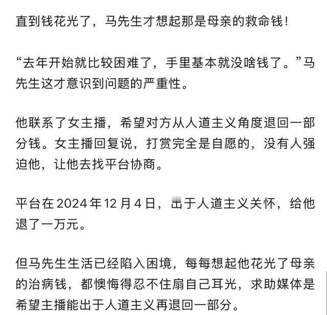 母亲病房外的长椅上,马先生捂脸痛哭的画面刺痛人心。这场悲剧里没有赢家:患者等待救治,儿子陷入悔恨,主播背负骂名。或许我们该追问:在流量至上的时代,那些被追捧的“家人”们,是否也该对屏幕后的真实人生存有敬畏?