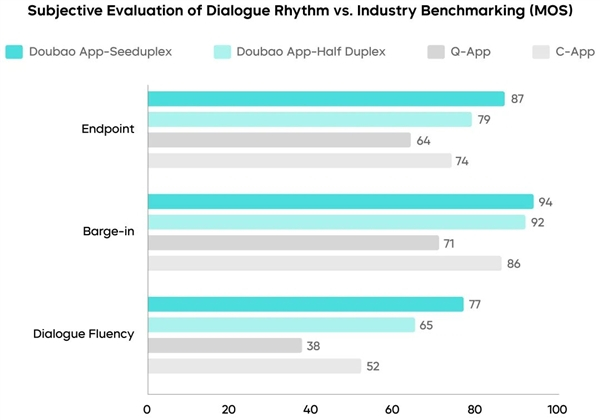 多维度评测显示,Seeduplex在对话的流畅度和节奏感上,均显著优于传统的半双工方案及行业主流App的语音通话功能;在判停表现上,模型相比半双工方案提升了8%,展现出更接近自然对话的分寸感。
