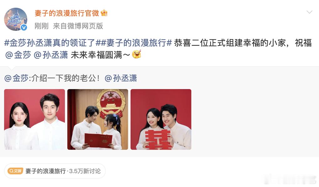 妻子的浪漫旅行恭喜金莎孙丞潇领证金莎孙丞潇领证双向奔赴终成眷侣!今日最大糖分已送