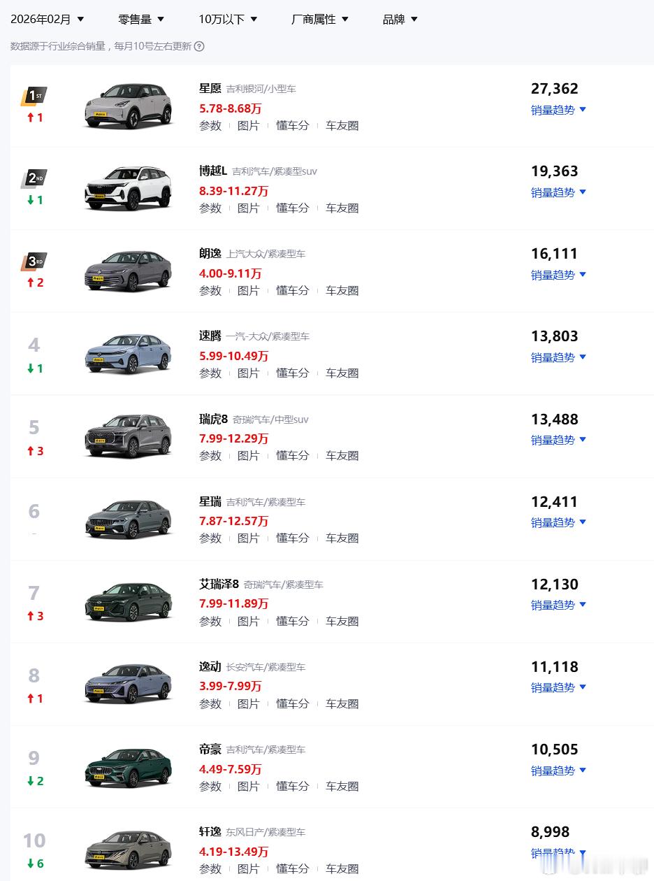 图1/2,是2026年1月、2月的交付量排行榜(10万以下),前十里面没有一个是比亚迪的。