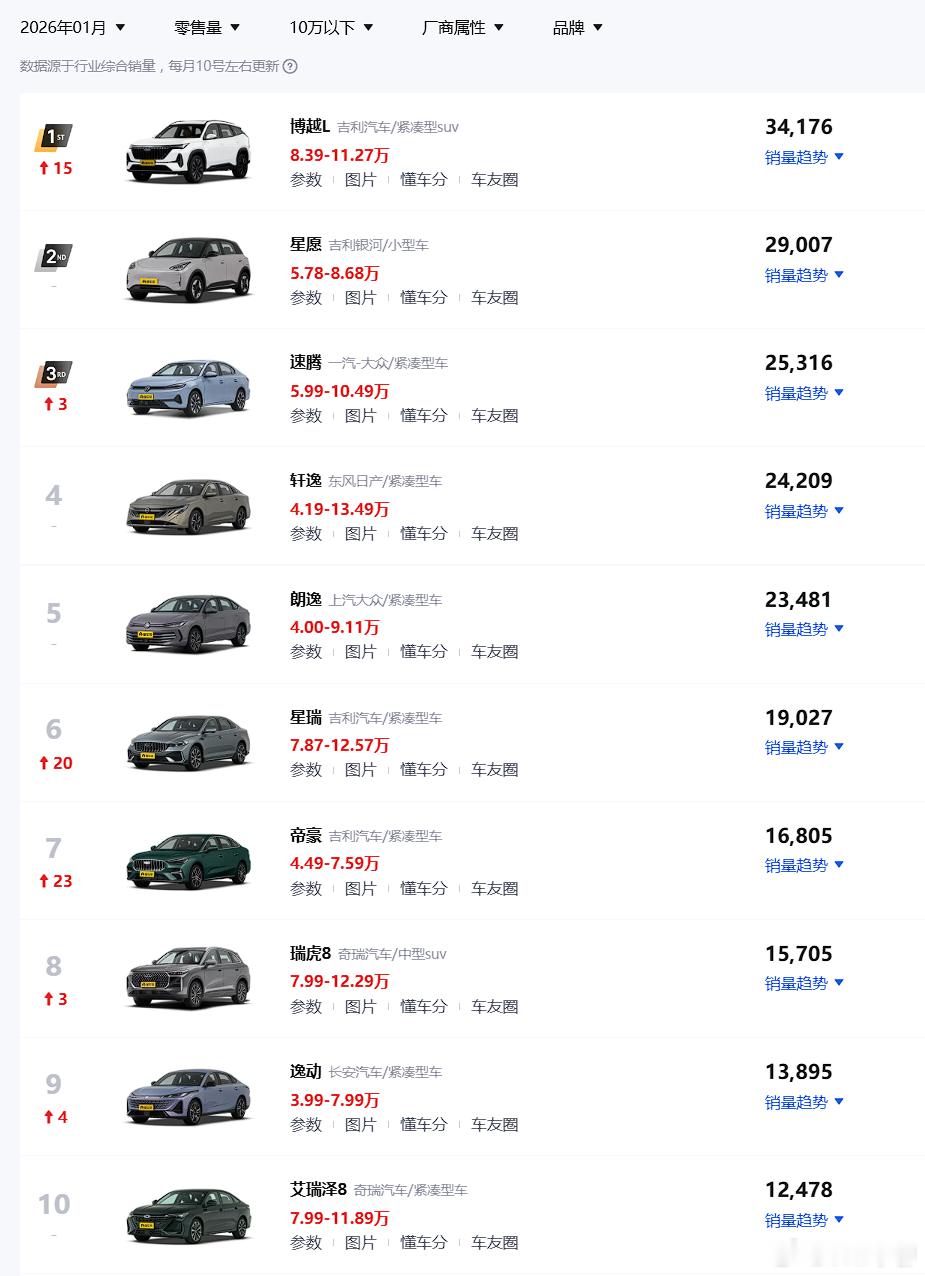吉利的星愿牢牢占据第一,这个不多说了,前十里面的博越L/星瑞/帝豪都是吉利的。