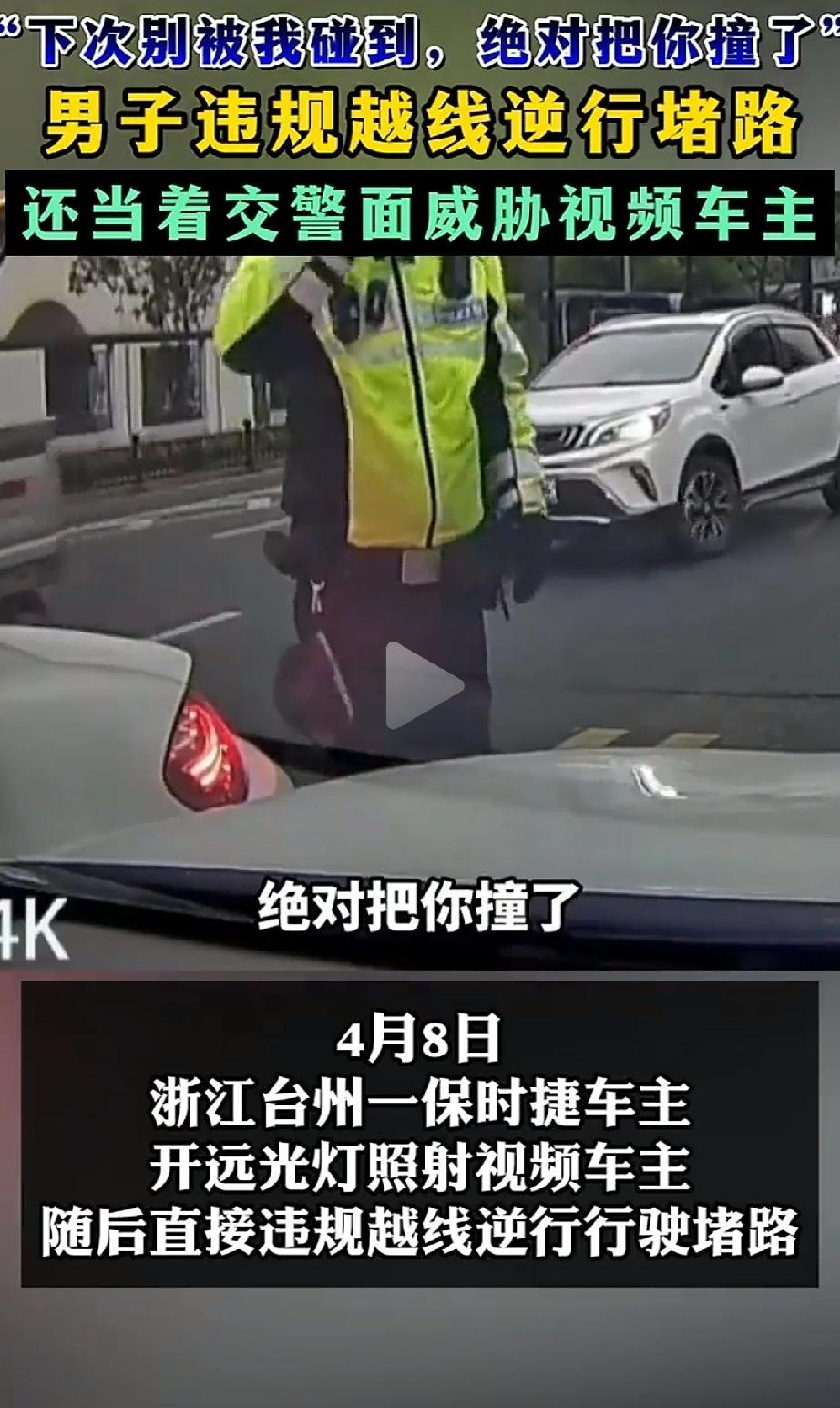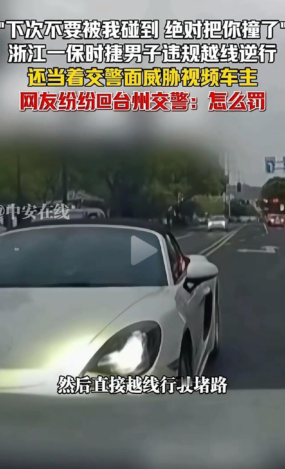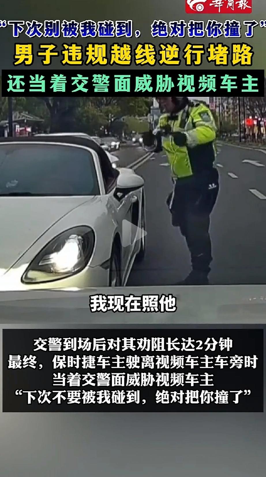 太嚣张!浙江台州,一辆白色保时捷车主先是开远光灯恶意照射正常行驶的视频车主,接着直接越线逆行,把对方车辆堵得动弹不得。交警到场后,足足劝了2分钟,车主才不情不愿地离开。最气人的是,他驶离时竟当着交警的面,恶狠狠地对视频车主说:“下次不要被我碰到,绝对把你撞了!”