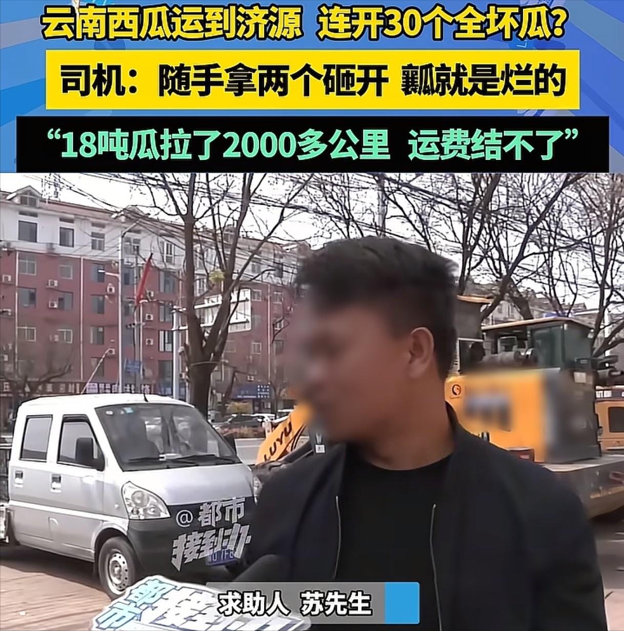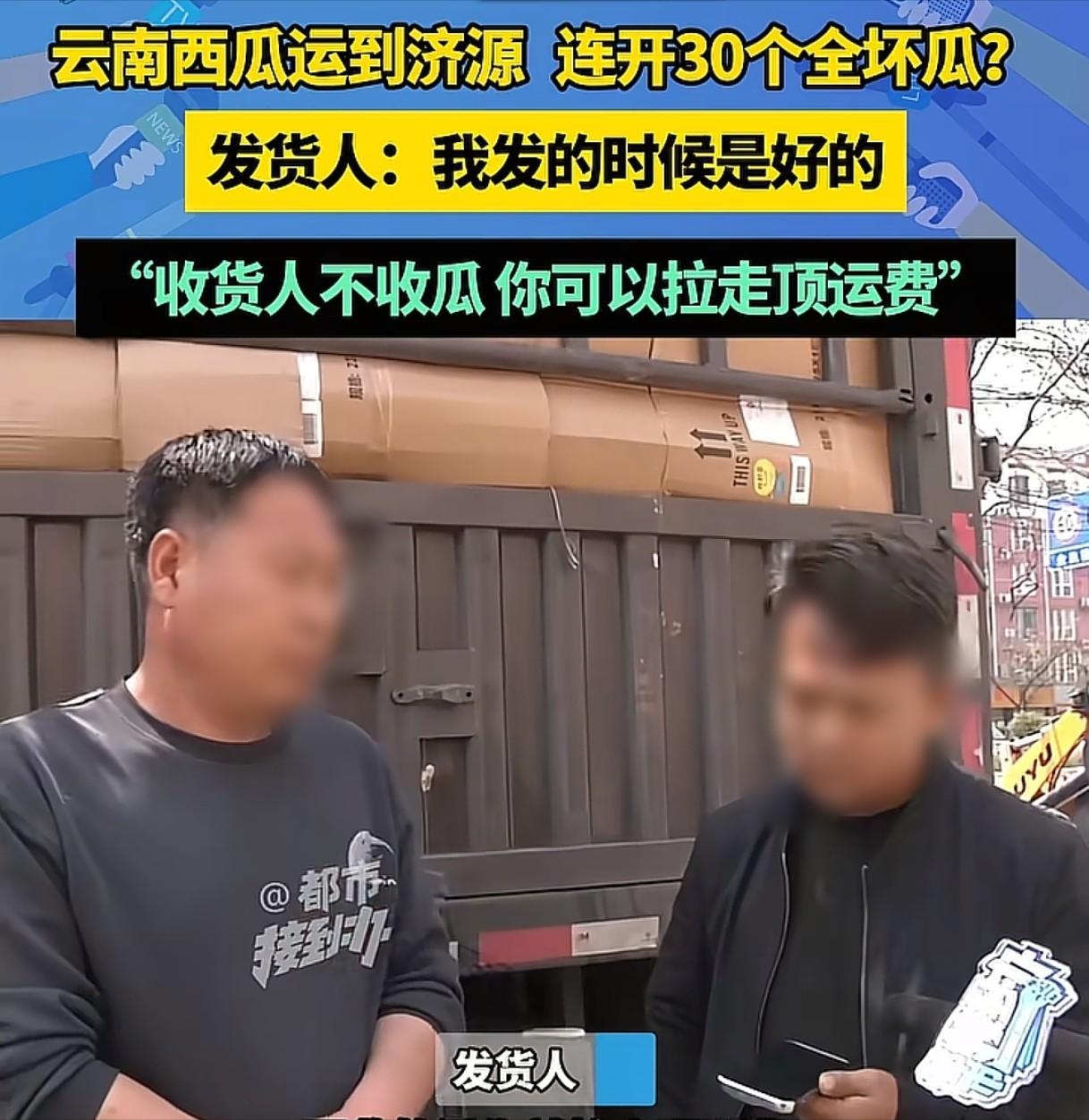 男子从云南运了18吨西瓜到济源,可收货方一检查,连开了30个瓜,外面都是好好的,可里面的瓤都是坏的,说什么都不肯结算运费了。男子的车也走不了,联系发货方,发货方却说如果对方不收,那就让男子把西瓜拉走顶运费。男子傻眼:这都是坏了的瓜,我拉去卖给谁,猪都不吃。
