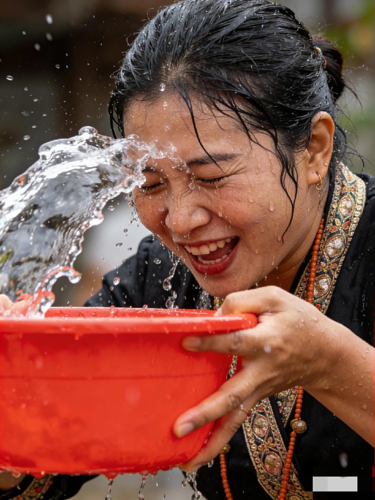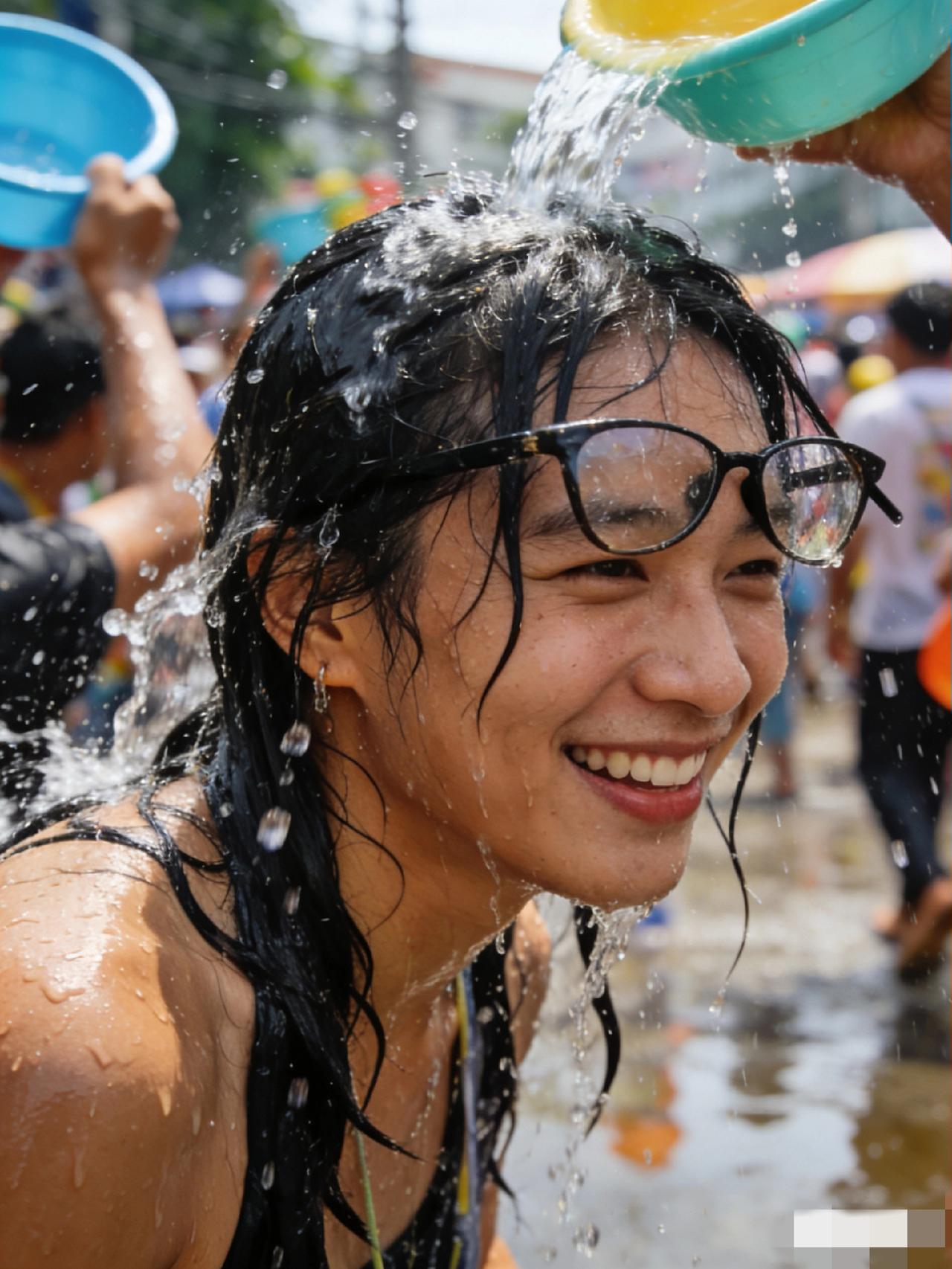 我刚走到广场边上,还没来得及掏出手机拍照,一桶水就从天而降,从头浇到脚。真的,一桶!不是水枪,是那种家里洗衣服用的大红盆!我当时整个人懵了,眼镜上全是水,衣服贴在身上,鞋里能养鱼。