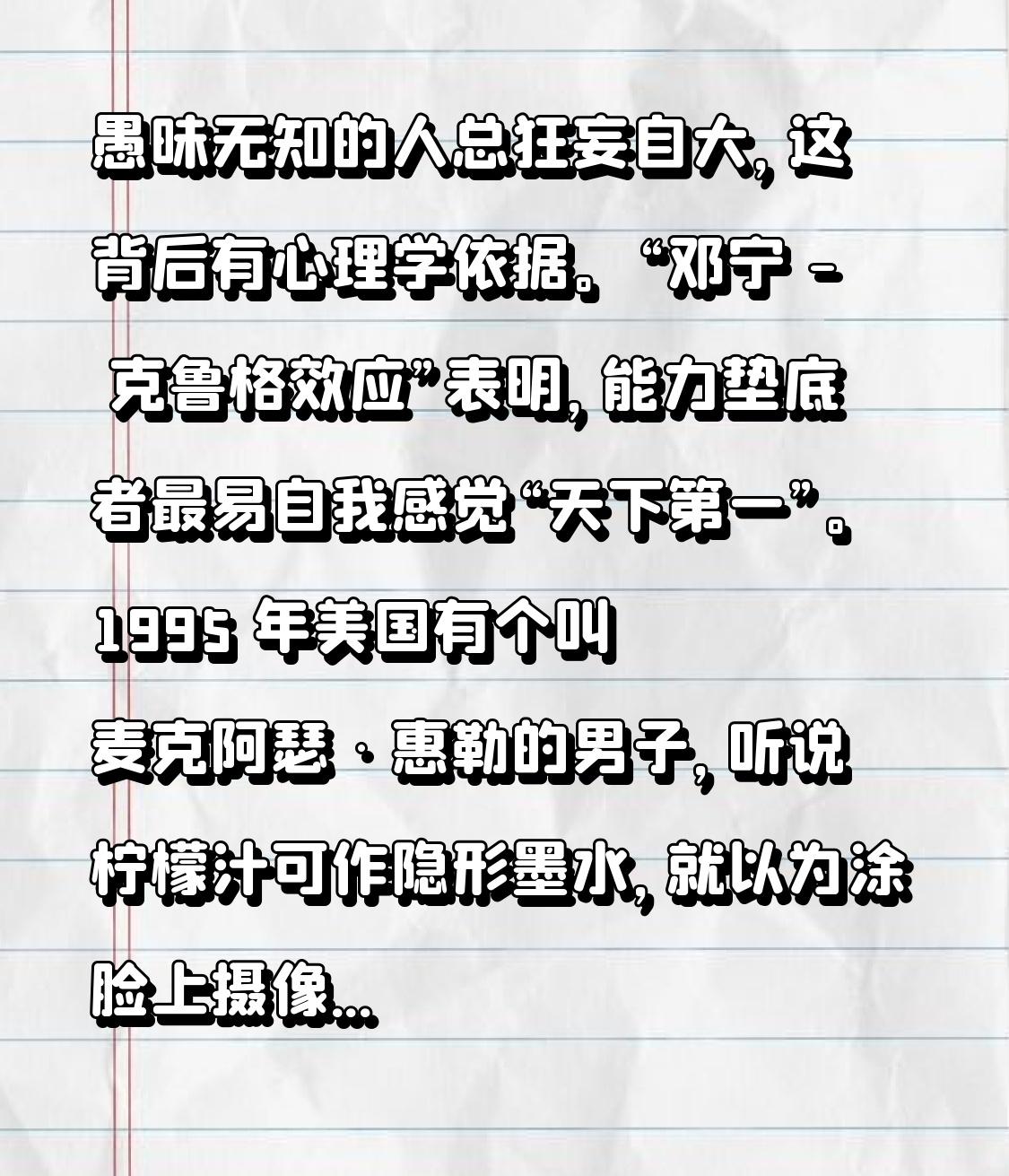 愚昧无知的人总狂妄自大,这背后有心理学依据。“邓宁 - 克鲁格效应”表明,能力垫底者最易自我感觉“天下第一”。1995 年美国有个叫麦克阿瑟·惠勒的男子,听说柠檬汁可作隐形墨水,就以为涂脸上摄像头拍不到自己,光天化日抢银行,一小时就被抓还拒不承认,活在自己荒谬逻辑里。
