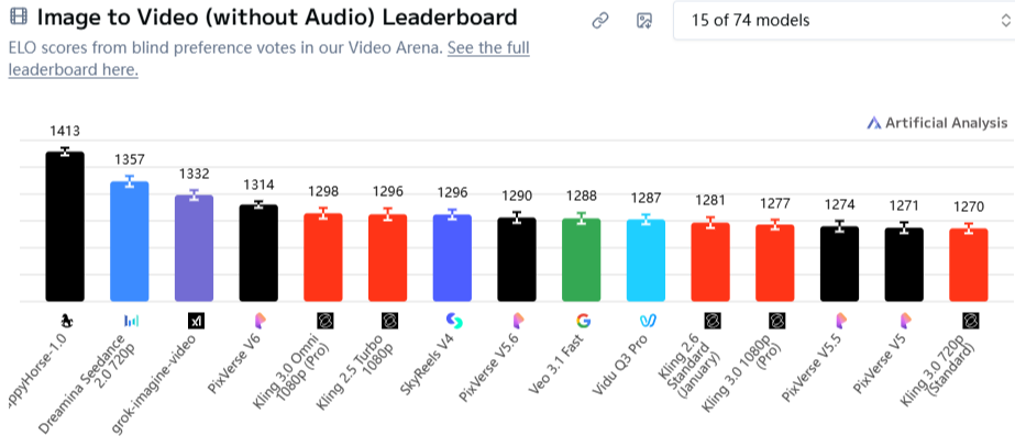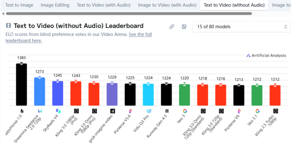 公开资料显示,ArtificialAnalysis的榜单采用盲测机制,让用户在不知模型来源的情况下对生成视频进行对比选择,并通过类似国际象棋的ELO评分系统汇总结果,形成基于真实用户偏好的排名体系。