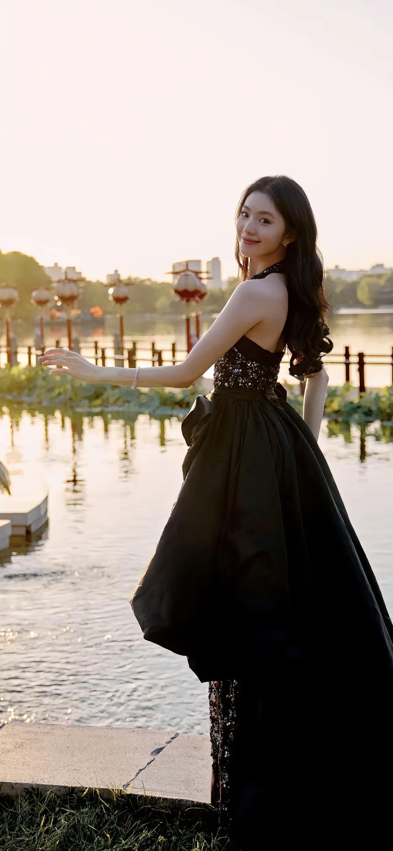 刘浩存,黑裙缀满细碎星光,巨型蝴蝶结勾勒浪漫轮廓,落日与光影交织间,是自带清冷氛围感的少女。