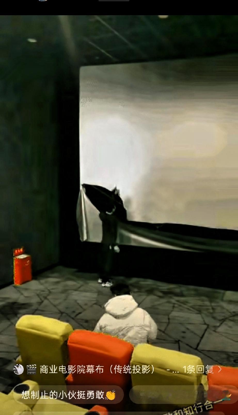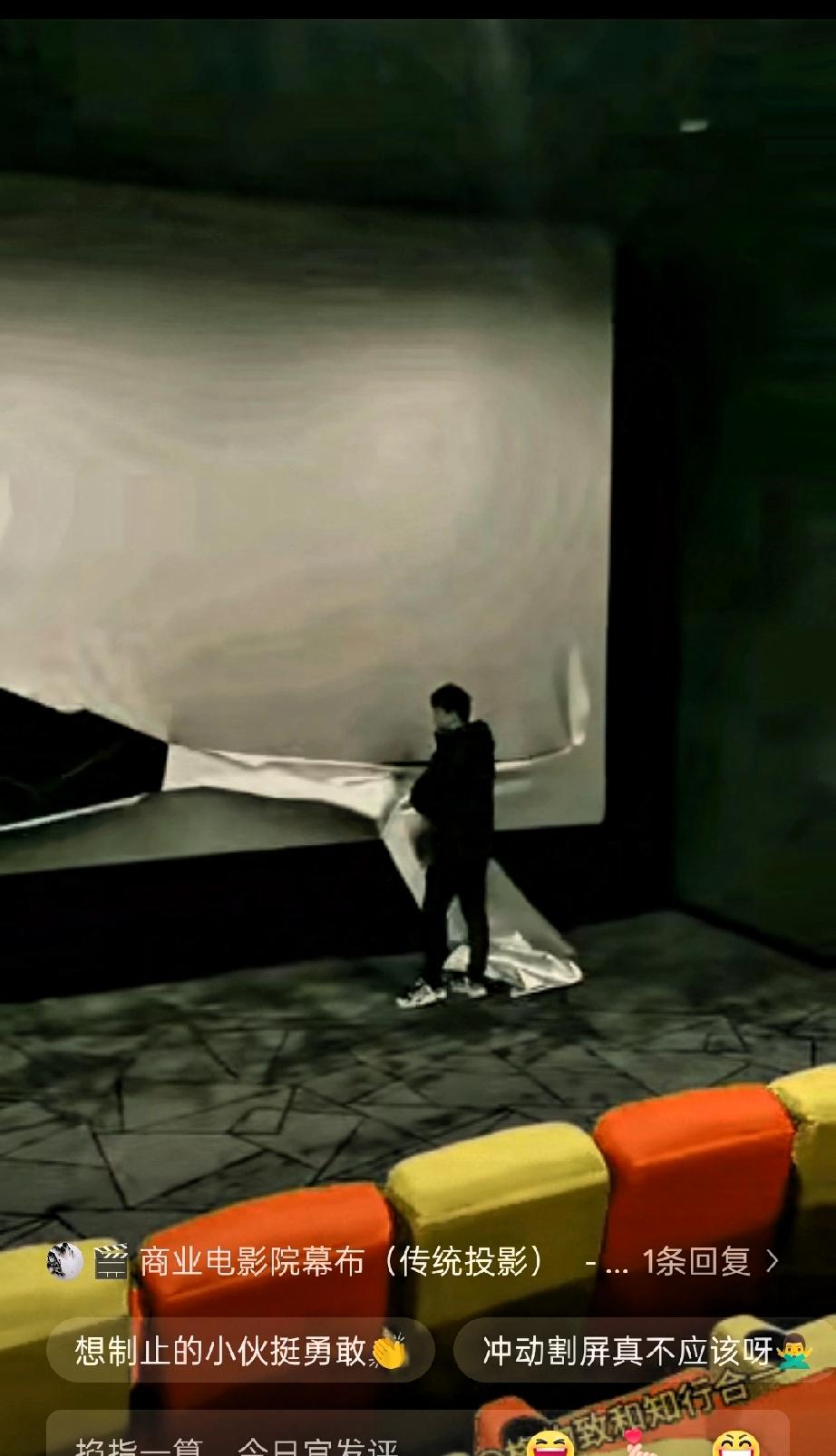 因为电影迟迟不放映,小伙子掏刀怒割荧幕,看他割得那么丝滑,动作很干脆,周围观众瞬