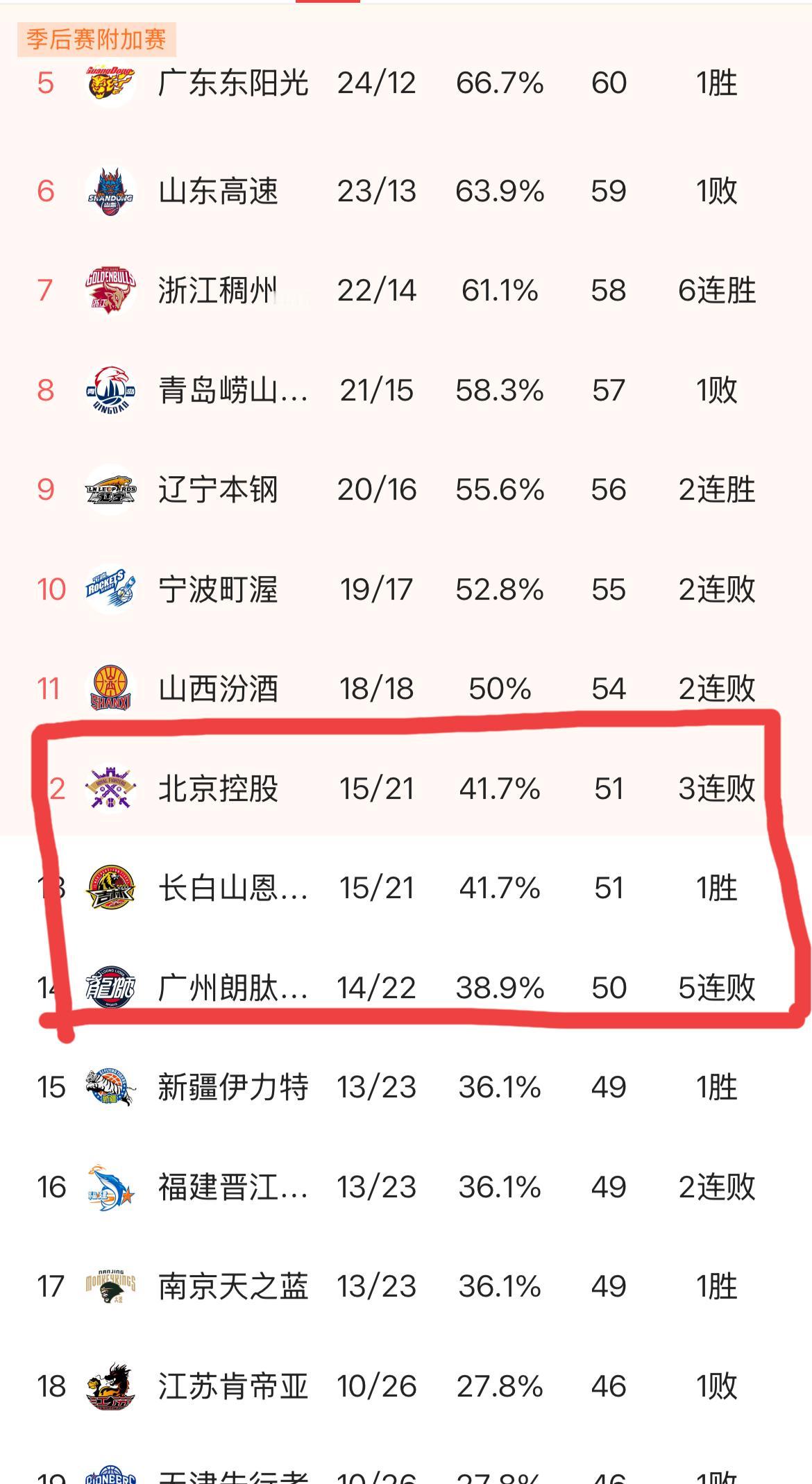 季后赛最后一个名额也卷到了极致,北控、吉林都是15胜,广州14胜,三支球队就抢一个位置。