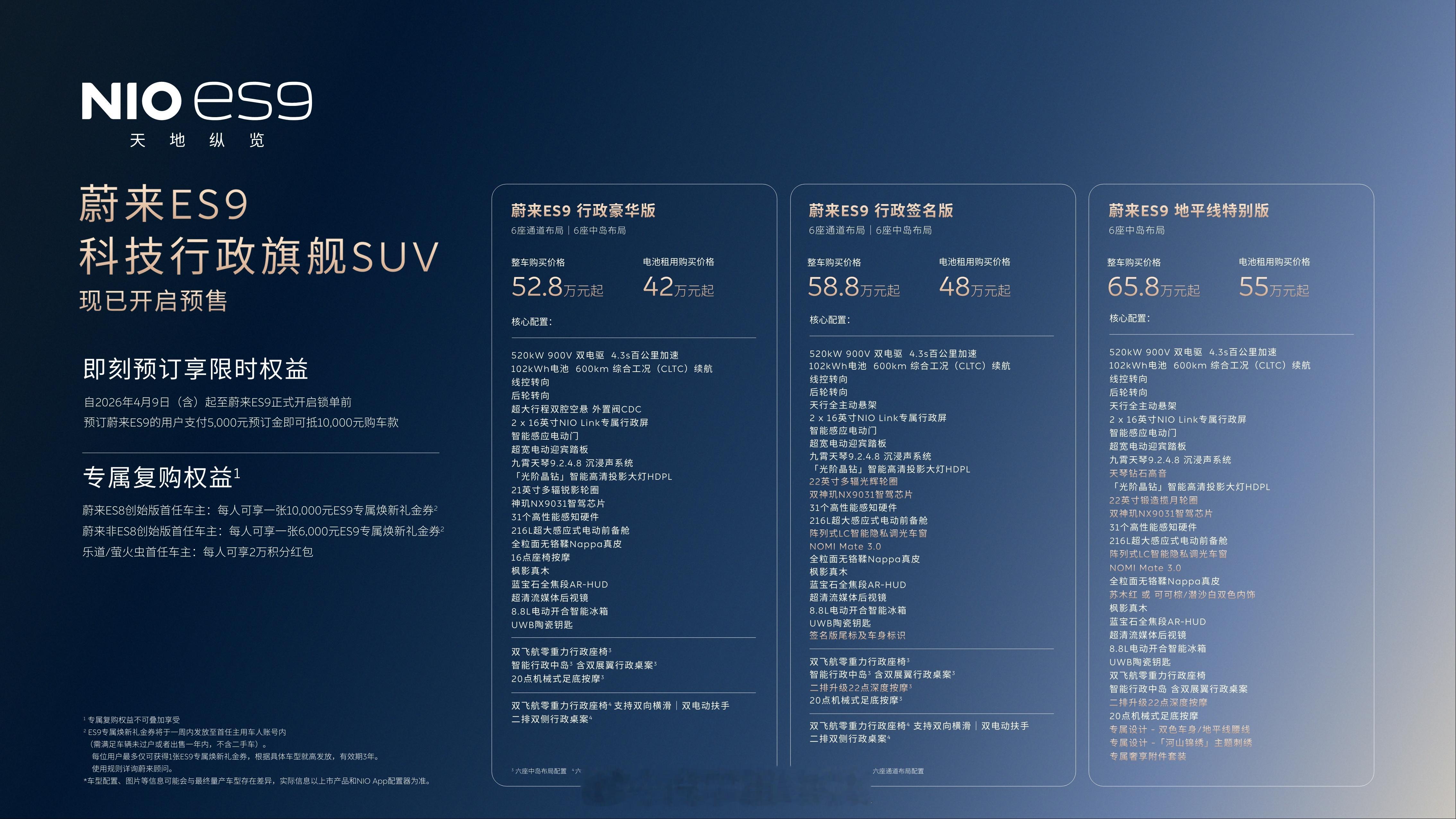 今天在杭州看了蔚来ES9的发布,这台车长超过五米三的大家伙,大家的第一反应大概是这辆车开起来会不会很笨重呢?答案是,并不会。因为它有后轮转向和线控转向,转弯半径只有五米四,比大家想象中灵活很多。我比较感兴趣的是二排那个带足底按摩的零重力座椅,配上那幅近四十万针的苏绣内饰,长途出差时坐在后面开会或者休息,应该挺舒服的。作为蔚来是十一年技术的集大成者,蔚来ES9预售价52.8w起,而电池租用方案价格则是42w起,比我之前预测的要低一点,还是挺有吸引力的!蔚来蔚来ES9ES9公布43项技术首创