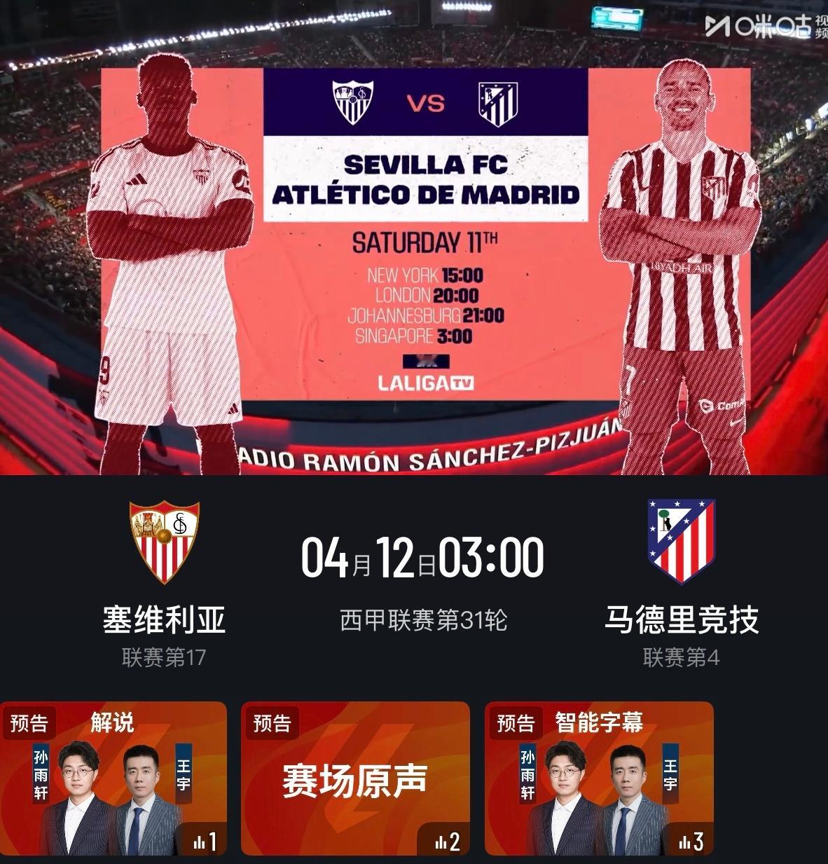 4.11/21:30 德甲/多特vs勒沃库森(咪咕)4.12/03:00 西甲/塞维利亚vs马竞(咪咕)4.12/20:00 中超/深圳新鹏城vs云南玉昆(咪咕)