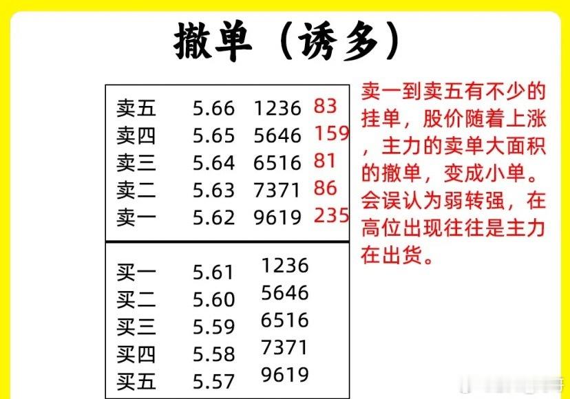 在盘口位置,买一到买五都有很多挂单,点燃市场情绪,等有大量跟风的时候,主力又会去撤单,其实这是吸引场外人跟风的一种手段,这个盘口一般会在高位出现,是主力想出货了,主力撤单结束以后,股价就会出现大幅下跌
