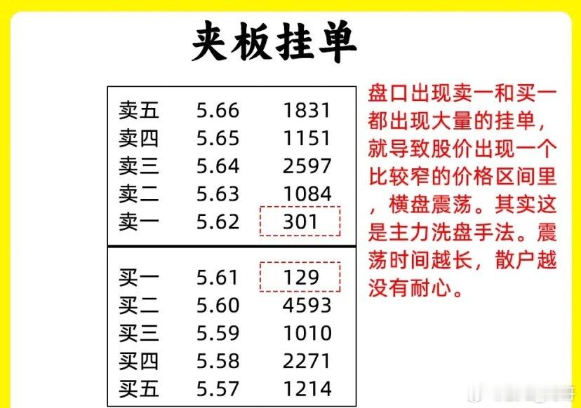 五、夹板挂单在买二到买五和卖二到卖五,都有比较大的挂单,只有买一和卖一的挂单比较少,形成一个夹击的盘口,所以就导致股价只能这个小区间里上下运行,一般出现这种情况,股价一般是低位,主力想做到控盘,所以主力洗盘吸筹,筑底的过程里。