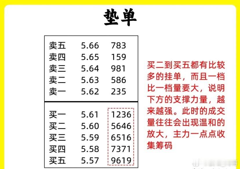 也叫托单。在盘口位置,买二到买五的价格区间里,有大量的挂单,股价一旦回调这个位置,就有很强的承接力量,不让股价继续下跌。整个盘口就行买盘很大,卖盘挂单很少。一定要注意的是,股价下跌到这个位置,是否出现真实撤单,是不是虚晃一枪,所以,大量的托单,成交量缩量就很虚,出现放量才是真托单,支撑强