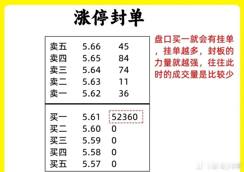 个股出现涨停以后,在盘口的买一就很多挂单,这些挂单的是为了能封住涨停板,不让他出现炸板回落的机会,当然也会有想挂单买入,博次日行情。所以此时封单量就得大小就比较重要,封单量越大,说明涨停越强势,全天走势会更稳定。如果全天出现多次炸板回落,说明市场分歧比较大