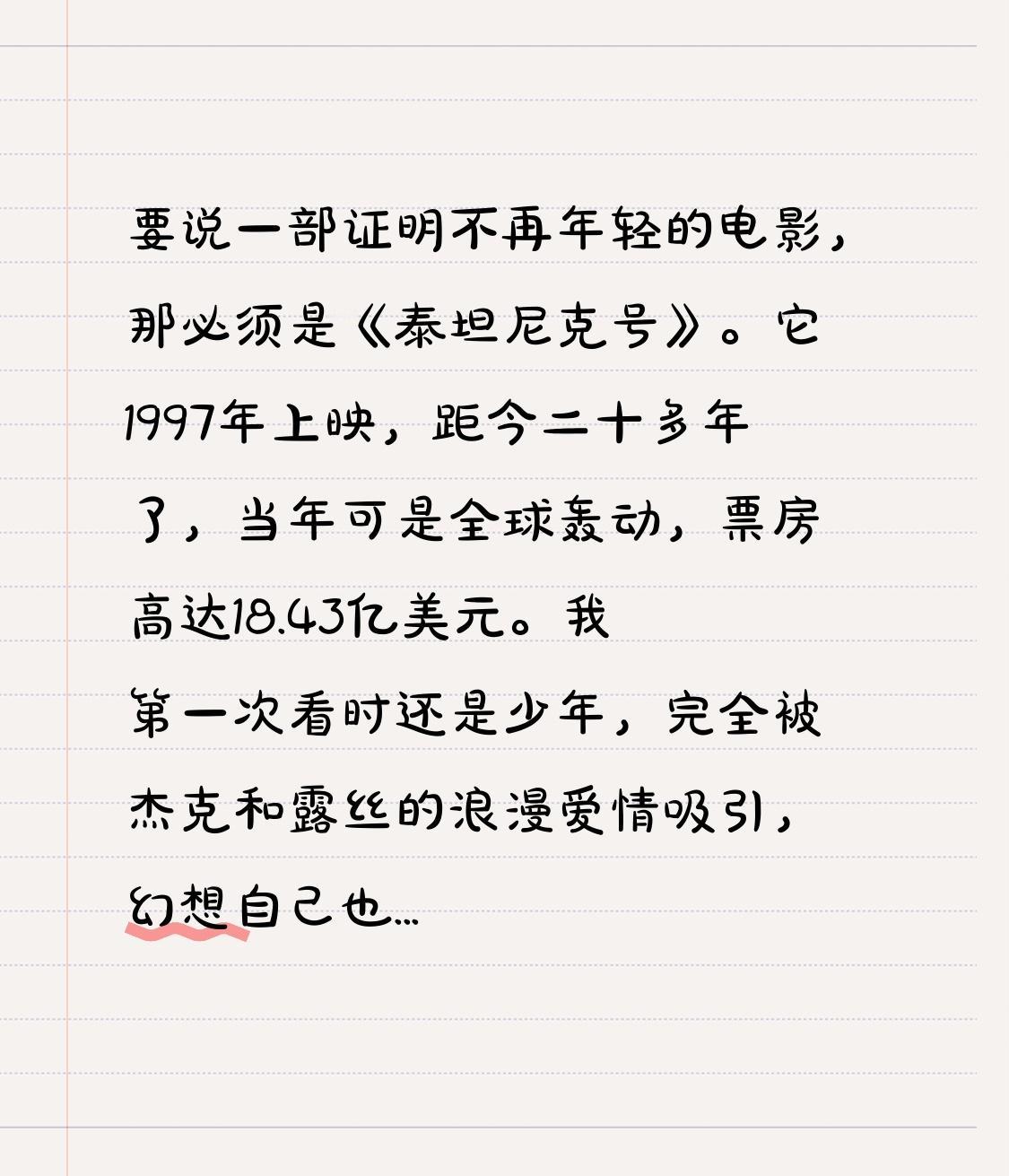 我第一次看时还是少年,完全被杰克和露丝的浪漫爱情吸引,幻想自己也能有那样的邂逅,觉得爱情就是一切。可随着时间推移,再看这部电影,关注点就变了。不再只盯着爱情,开始思考背后深层意义,看到人性复杂,灾难面前人们的恐惧、自私与善良,也看到历史的残酷。曾经青春年少的我们,如今已在岁月中成长,《泰坦尼克号》就是青春远去的见证。