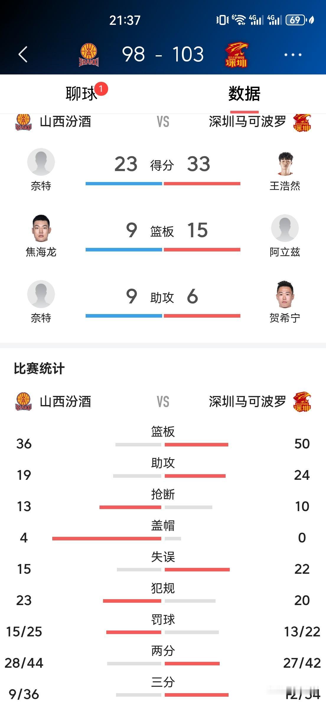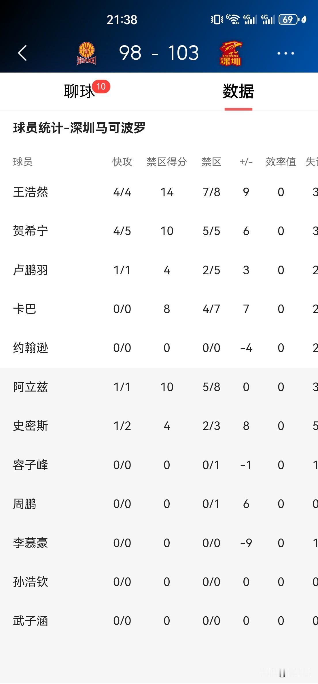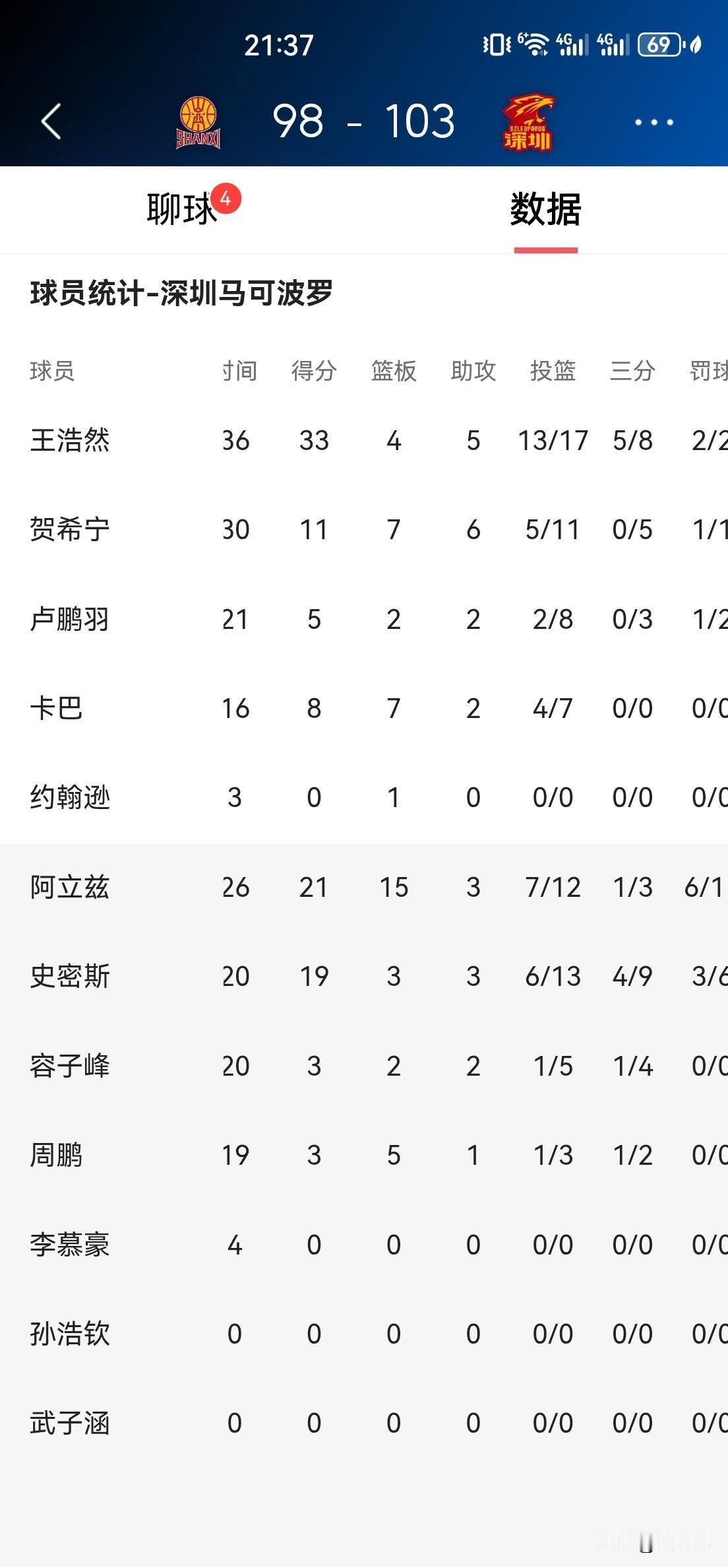 王浩然在攻防两端势不可挡,出场36分钟,17投13中,三分球8投5中,罚球2罚全中,快攻4中4,禁区内8中7拿到14分,砍下33分4篮板5助攻,正负值全队最高的+9。