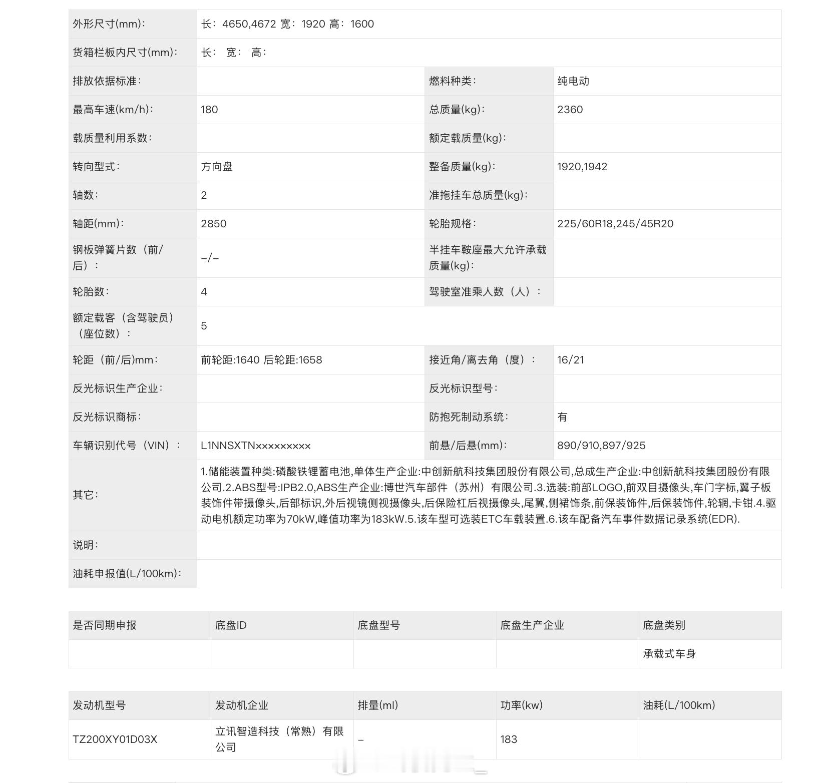 中创新航提供的磷酸铁锂电池,单电机功率183kW,这次申报的是纯电车型。