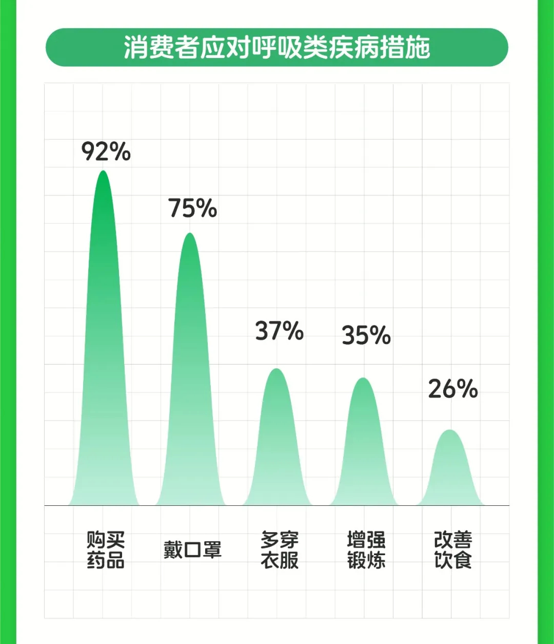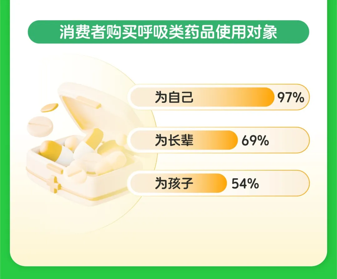 当前,消费者的购买行为正日益受到“家庭式”理念的影响,这一趋势尤其在健康产品领域表现得尤为明显。随着对家庭成员健康的日益关注,特别是针对老年人和儿童这两个高易感群体,消费者在购买药品和健康相关产品时展现出了更强的针对性和预防性。调研数据显示,近七成受访者主动为家中长辈购买药品,同时五成以上的受访者也会准备儿童专用的呼吸类药物,为孩子营造健康、舒适的活动环境。