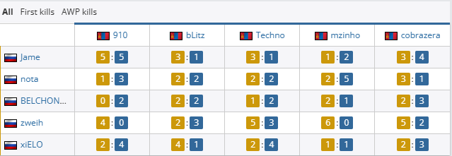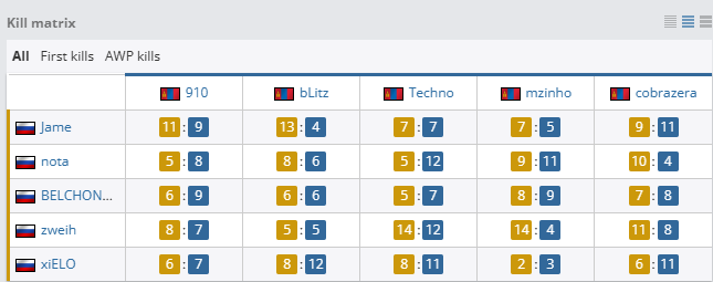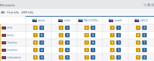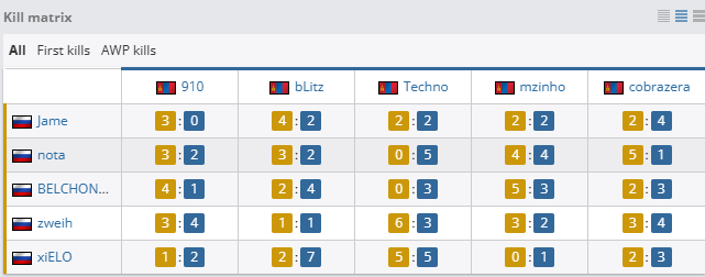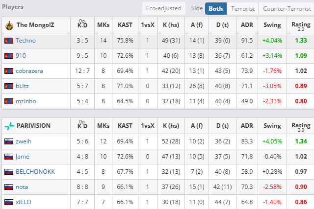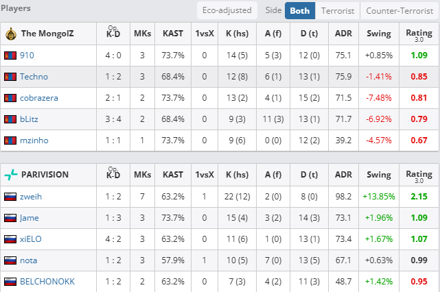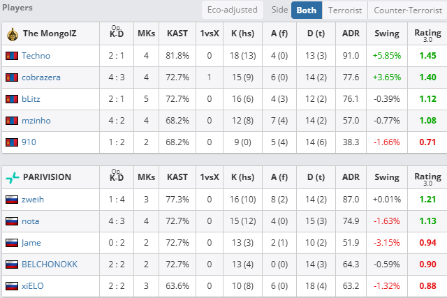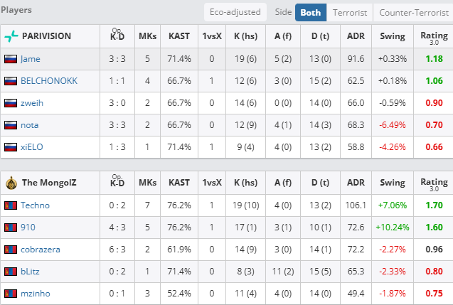 个人数据方面,Techno火力全开,拿下19次击杀,106.1的ADR与1.70的rating,而大狙屡屡建功的910同样拿到17次击杀和1.60的rating。PV方面,则只有Jame与BELCHONOKK状态稳定,分别拿到1.18与1.06的rating。