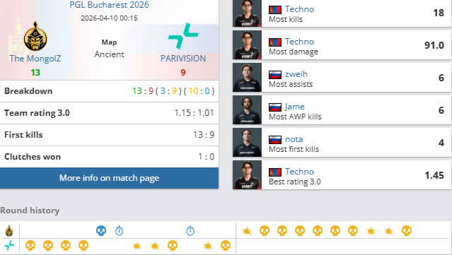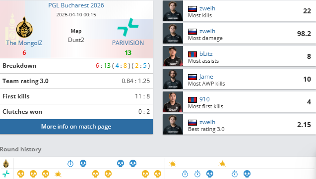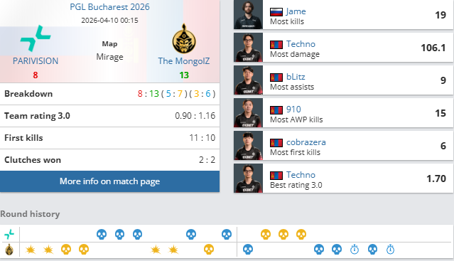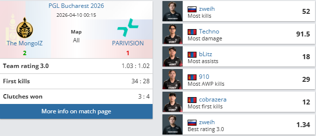 PGL布加勒斯特八进四淘汰赛,TheMongolZ对阵PARIVISION比赛结束,TMLZ2-1PARIVISION:大逆转!TMLZ图三逆转PV四强。
