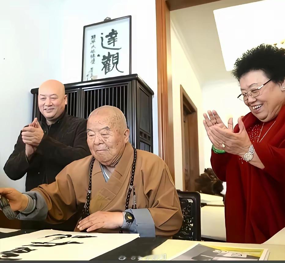 陈丽华生前与丈夫迟重瑞以及星云大师在一起时的留影,星云大师当场赠予他们墨宝。