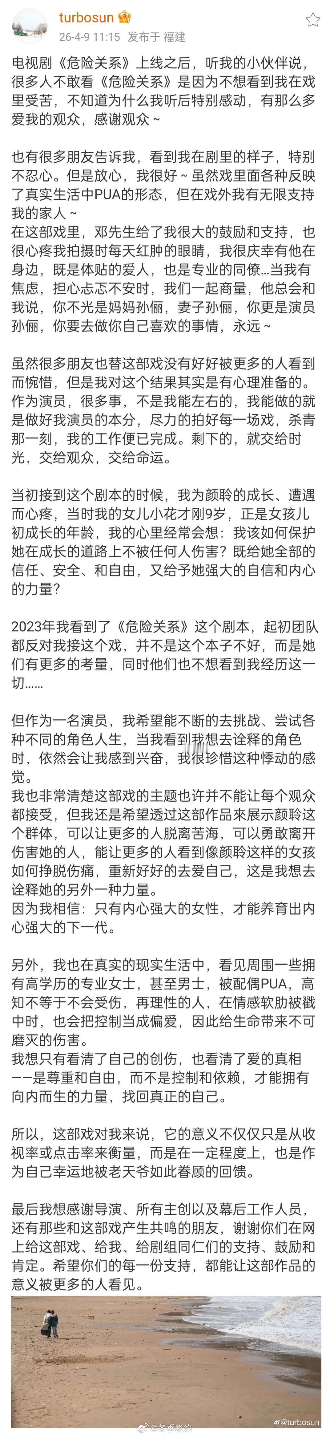 孙俪走心发长文聊《危险关系》,足足写了一千多字,写得太真诚了,这思想这文笔,有点