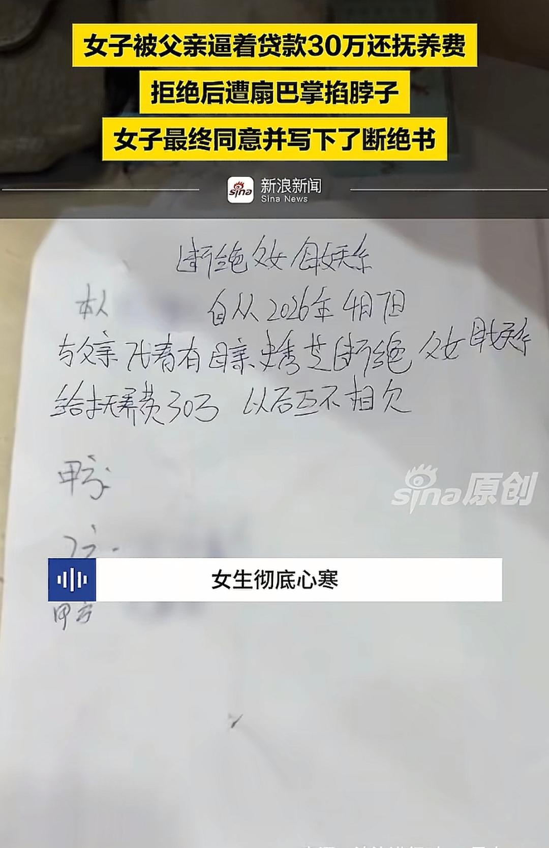 代女士被父母彻底伤透心,当场同意贷款并写下断绝关系的协议。