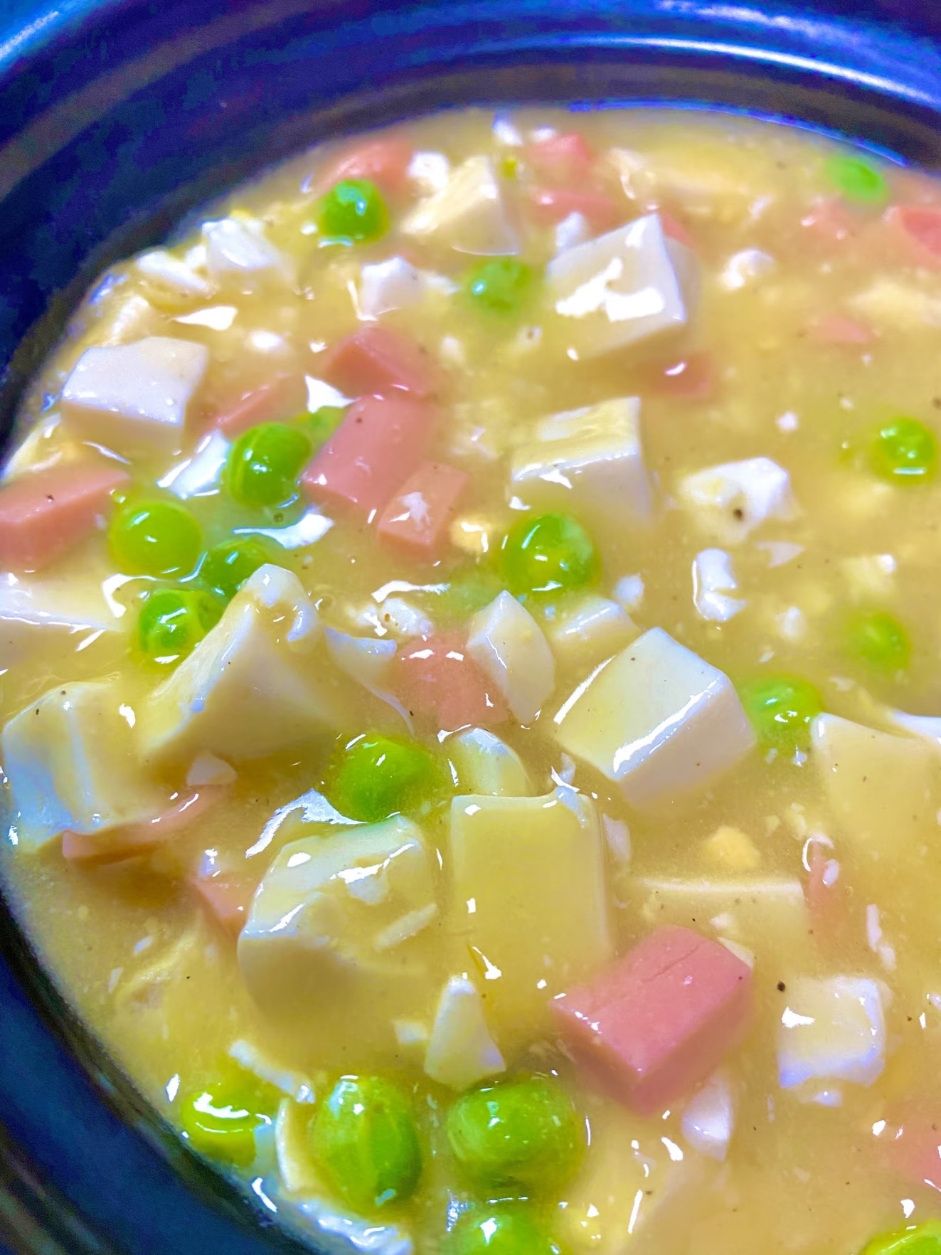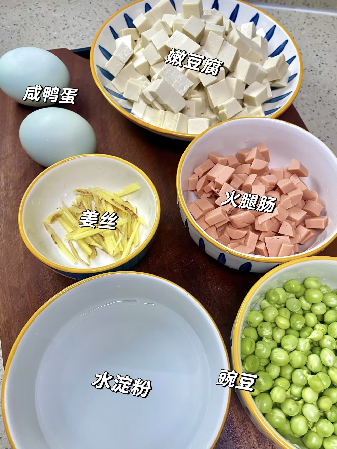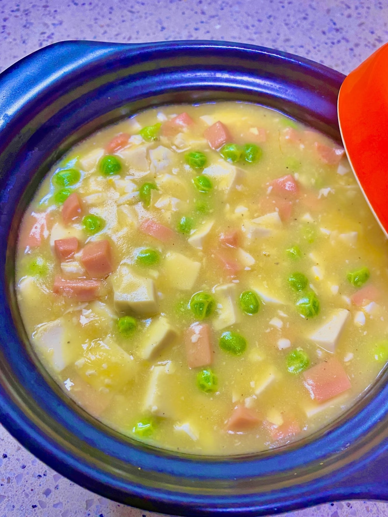 成品亮相:羹色金黄透亮,豆腐块晶莹饱满,豌豆绿得晃眼,火腿丁红星点点,香菜绿得像“森林星光”。先来一口羹——滑、嫩、鲜、香,四层味觉依次炸开;再嚼一块豆腐——软糯中带点韧,咸蛋黄的鲜香紧随;豌豆脆甜爆汁,轻轻一咬,豆香混着蛋香在舌尖跳舞;配一口米饭,汤汁渗进米粒,不知不觉碗底朝天;空口吃也过瘾,鲜到眉毛打秋千。