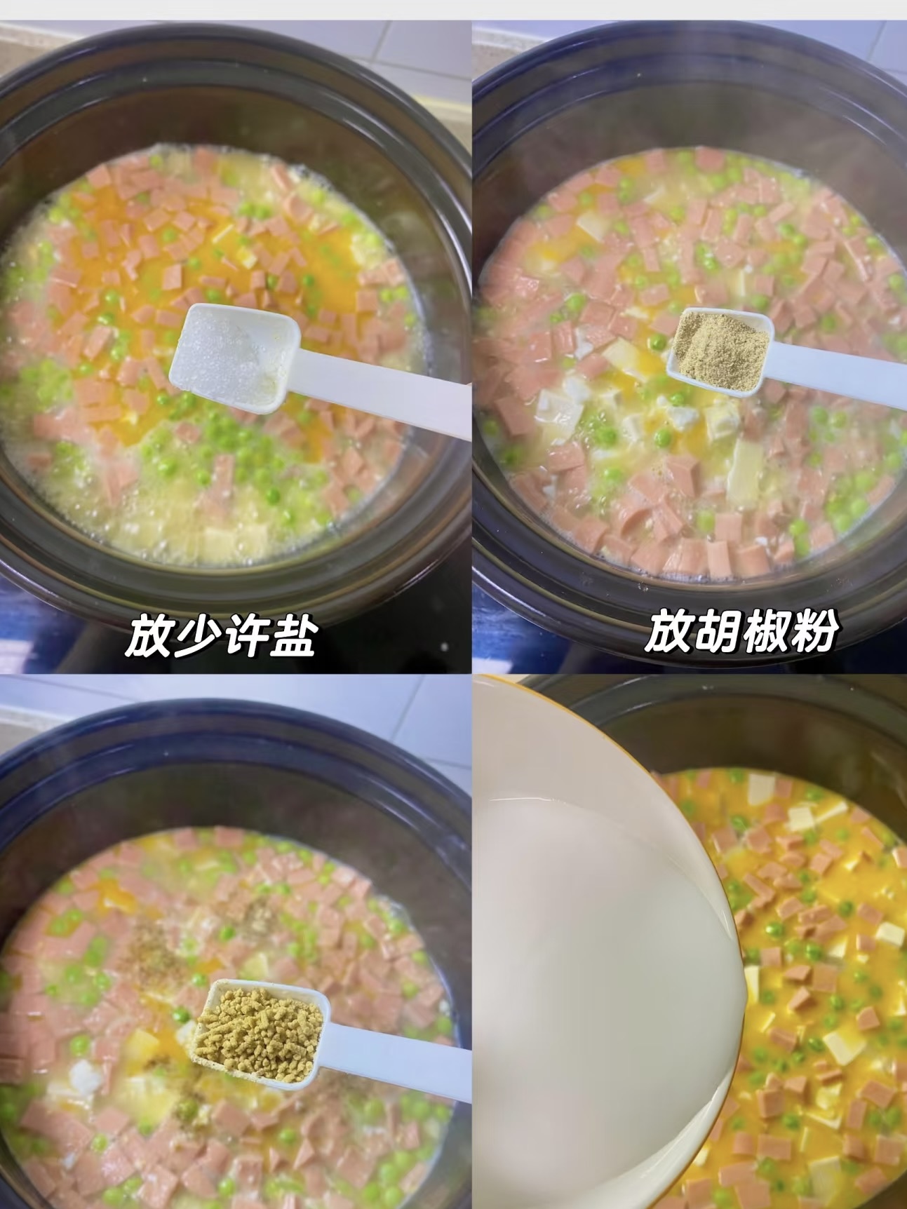 2. 宝宝版——去掉火腿丁,盐减半,豆腐更细腻,10个月+就能吃。